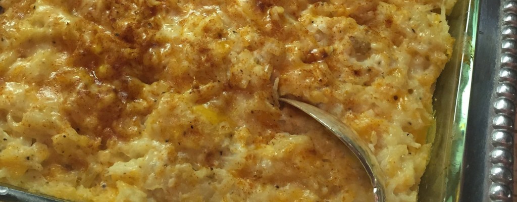 Combine all the ingredients, mixing well. Place mixture in a 13 x9 baking pan. Sprinkle Parmesan and cheddar on top as well. Bake covered at 350 degrees for one hour. Uncover and bake for an additional 10 minutes, or until the edges start to crisp. The casserole can be made a day in advance, but bake just before serving.