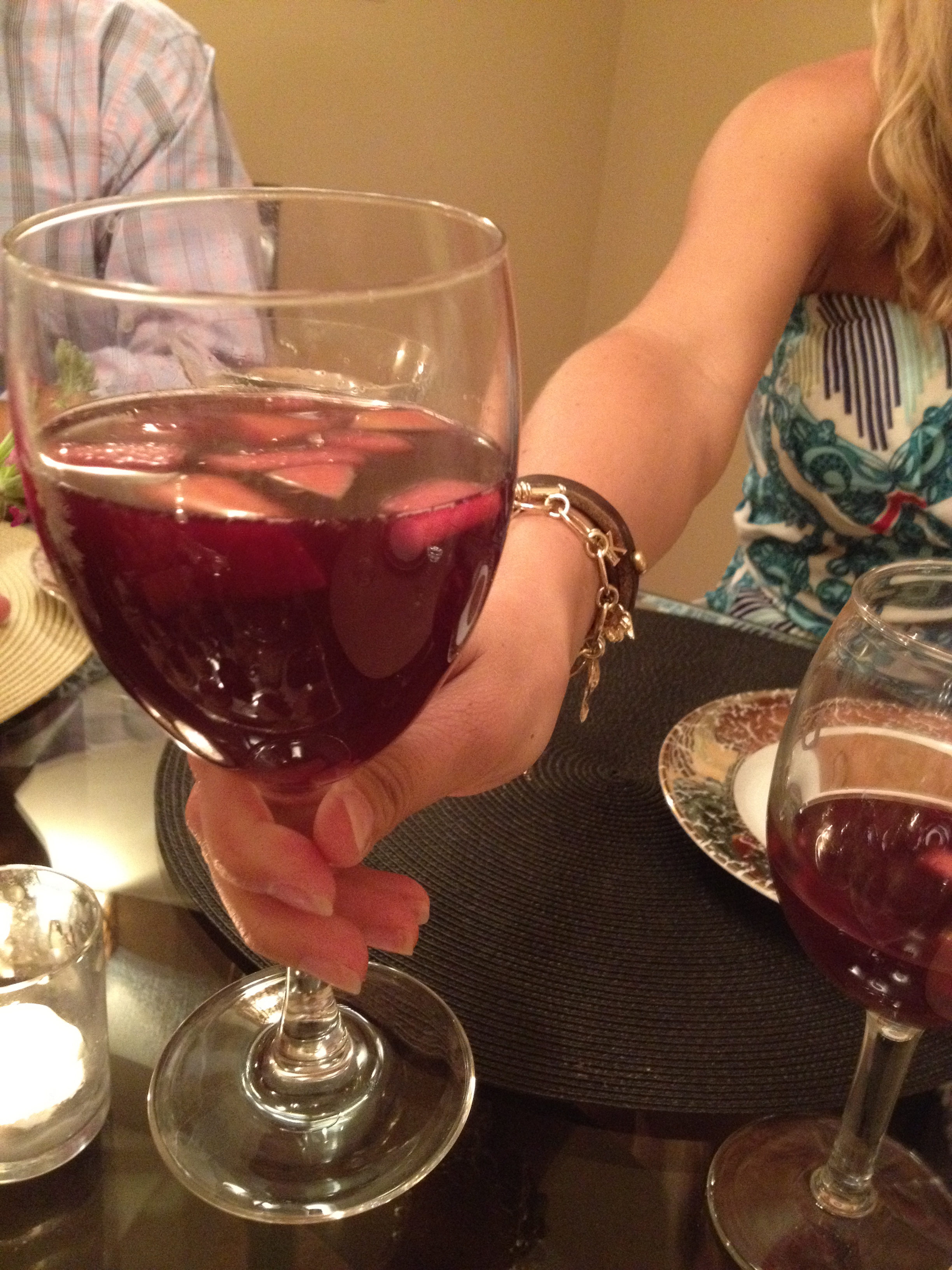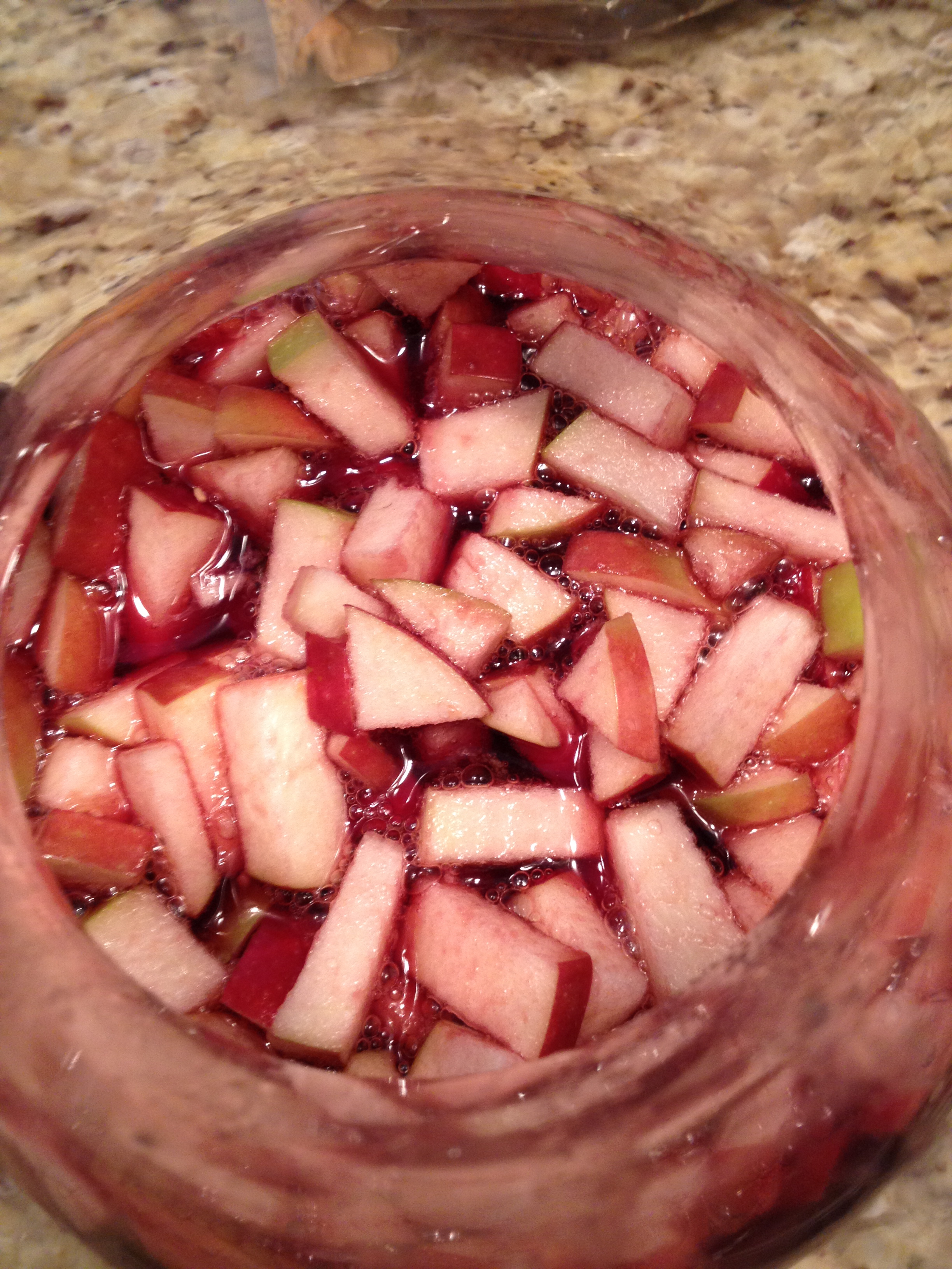 Mix all ingredients in a large pitcher. Allow the fruit to soak up the liquids, preferably a couple hours, before serving. Serve on ice or keep cold in the refrigerator. And keep extra ingredients handy…. we made four pitchers of this at the last dinner party!