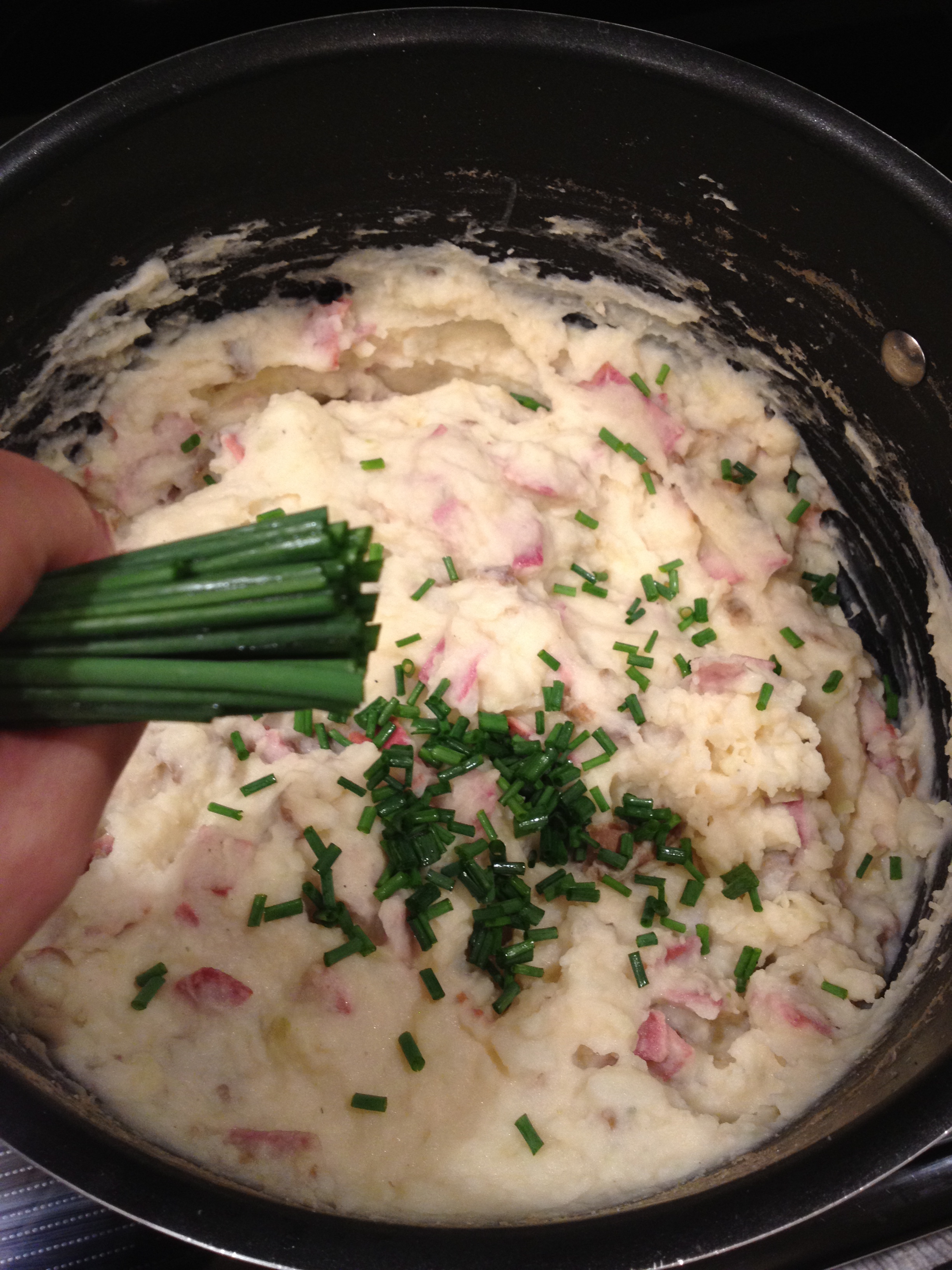 Next, mix in the chopped bacon, as well as the chives. Reserve both some bacon and chives for topping the potatoes when fully cooked. Season with salt & pepper.