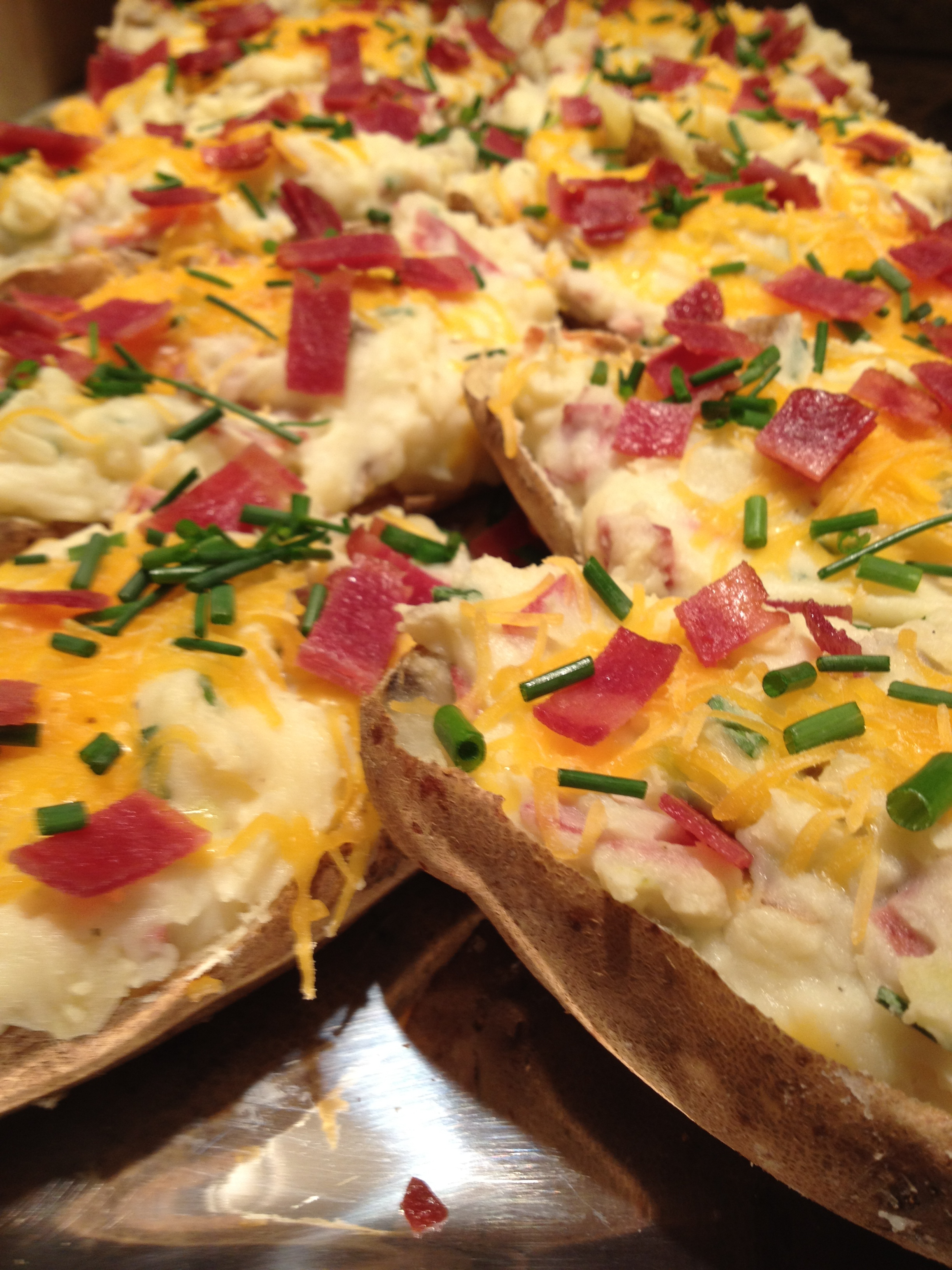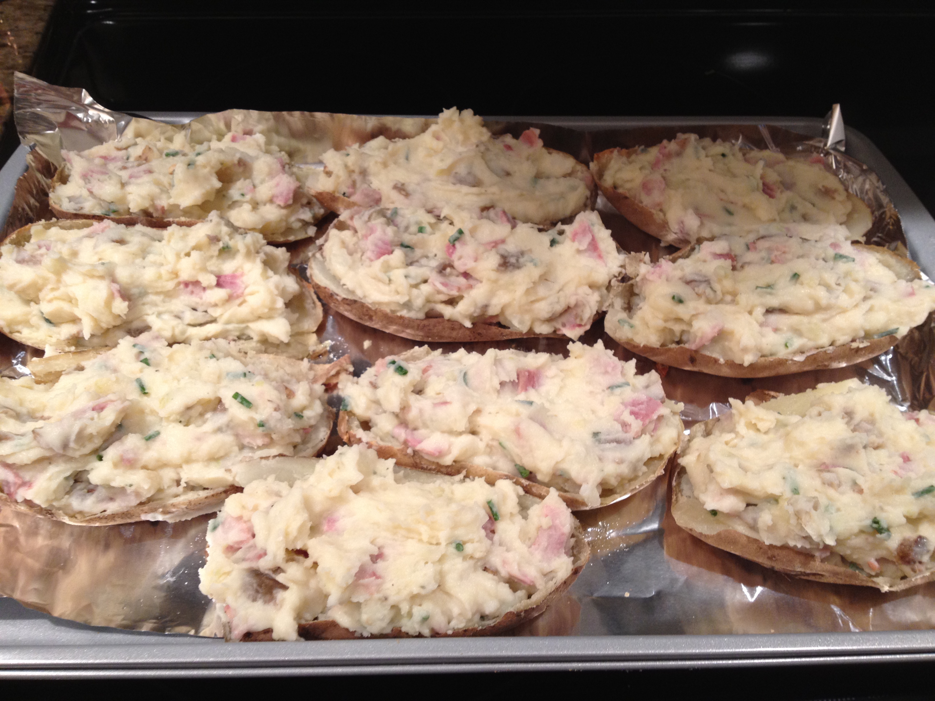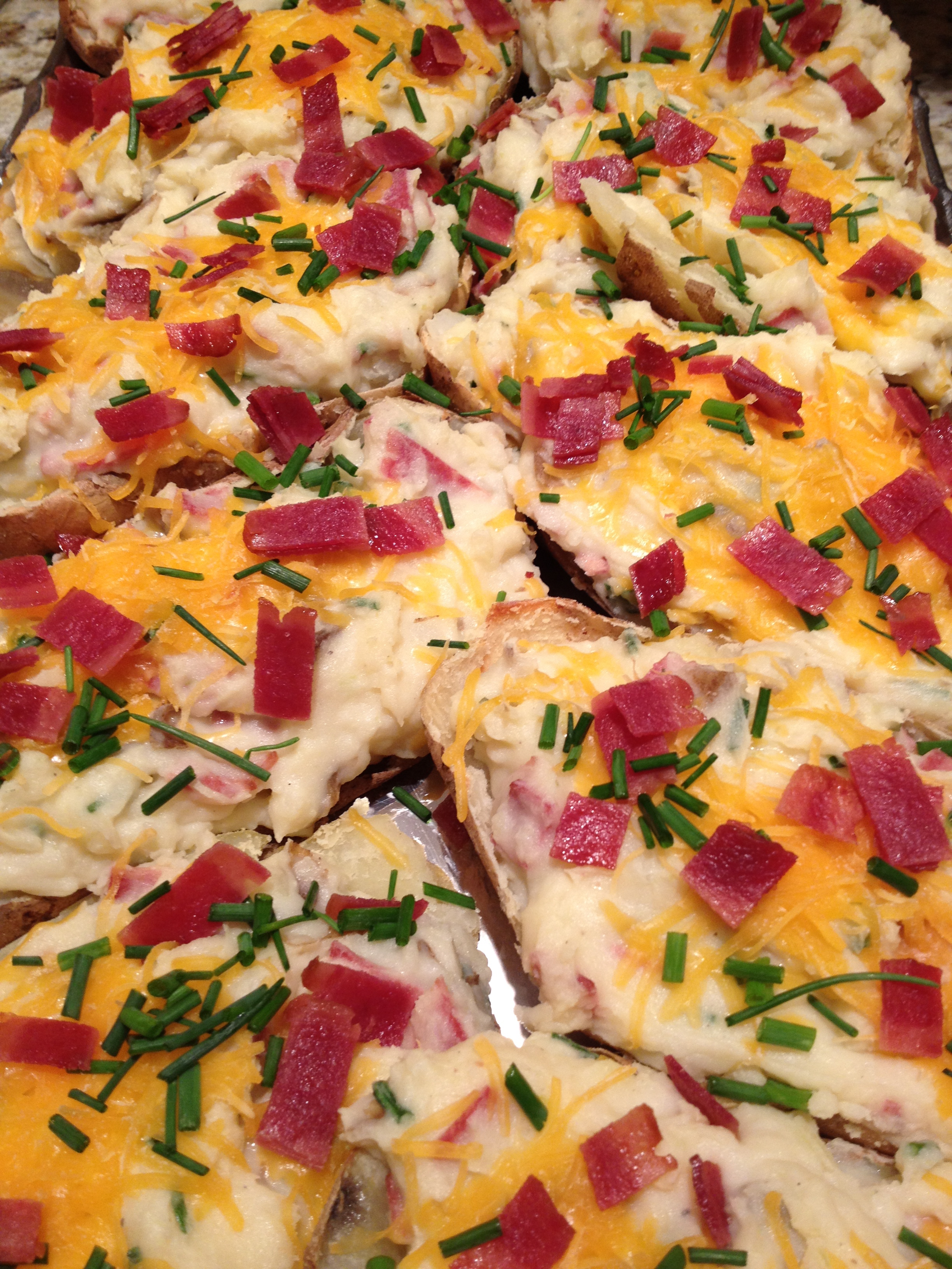 My challenge was to still keep the great flavor, but not all the calories. Inspired by Rachel Ray’s Mashed Potato Skins, I created the following dish: a twice baked potato that has the taste of a potato skin.