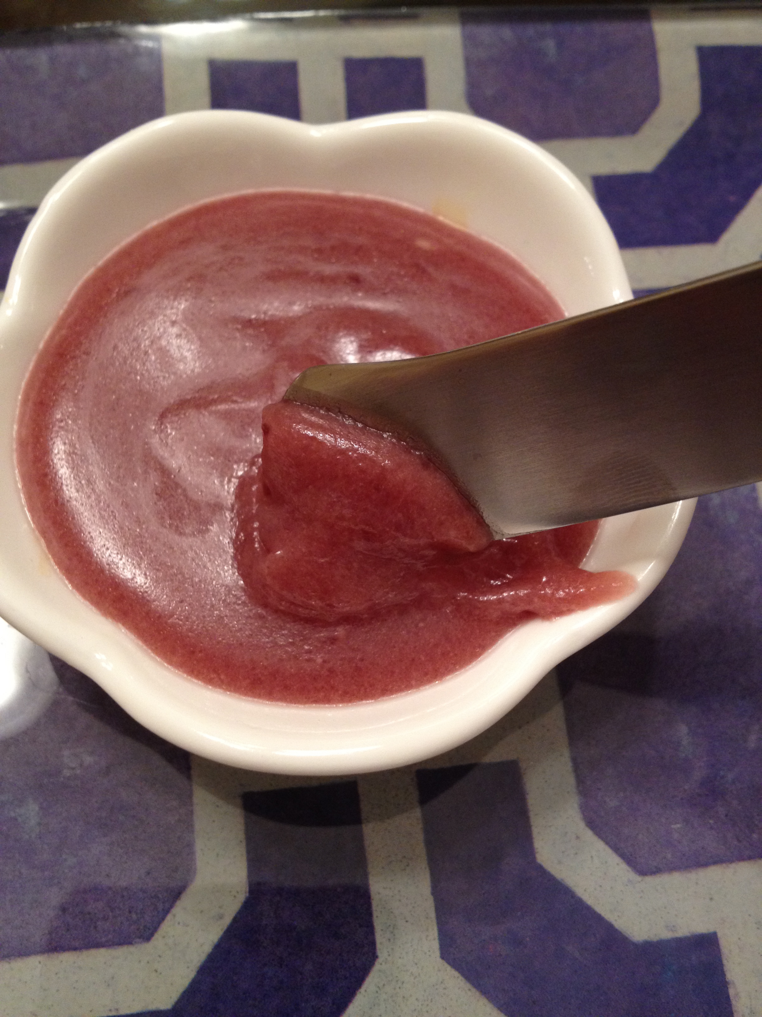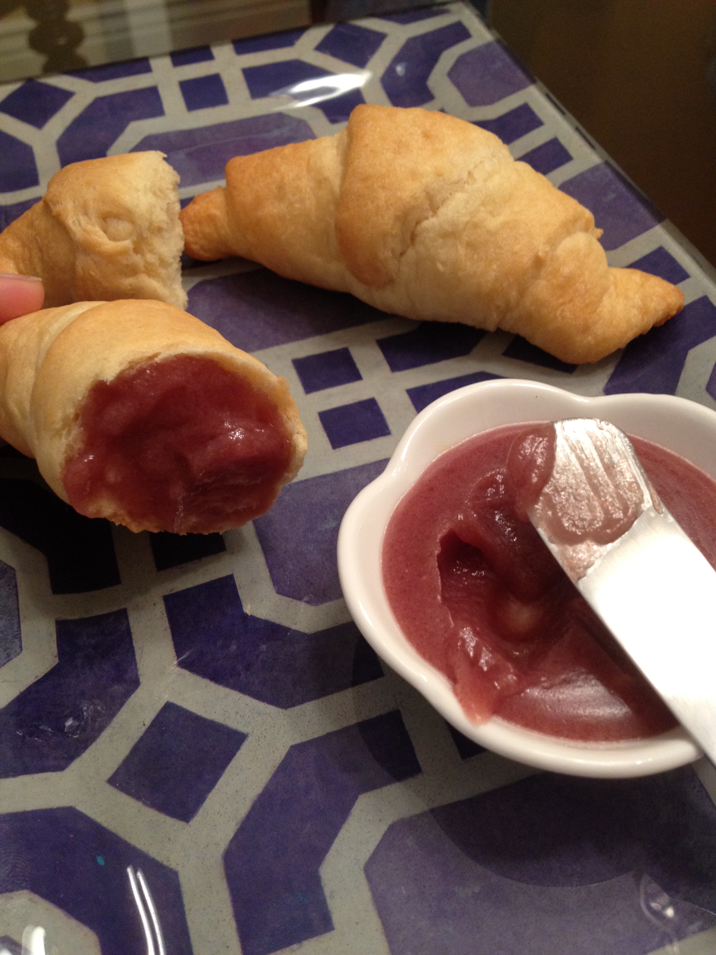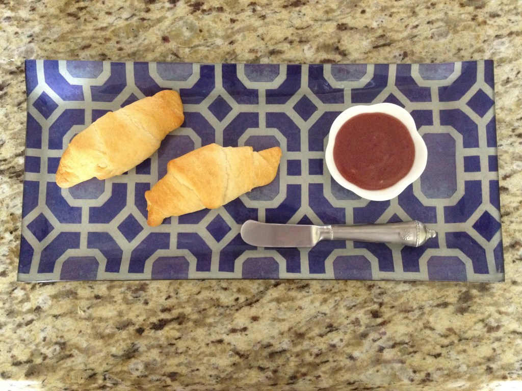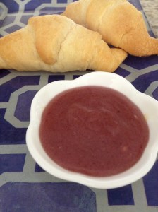 Scoop equal amounts of butter and jam into a microwave-safe bowl. Let the butter come to room temperature so it’s easier to mix with the jam. If needed, put the bowl into the microwave for a few seconds. You want to get the butter melted enough to really mix with the jam, but you don’t want it to turn to a liquid. Mix until smooth. The spread will turn back into the consistency of the butter, making it easy to spoon onto your pastry, but also melting into each nook and cranny. Mmm.