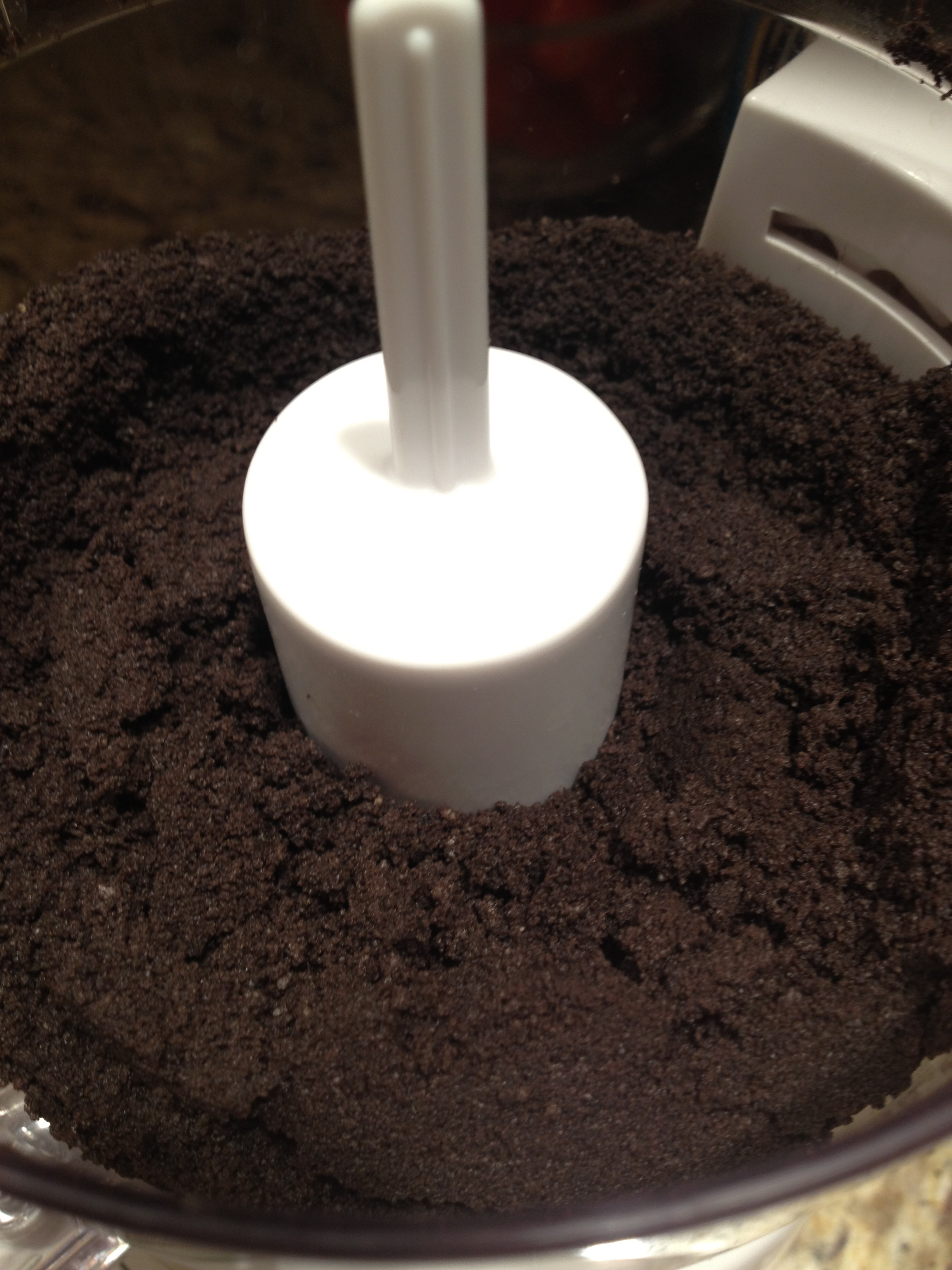 Place as many Newman O’s into your food processor as can realistically fit. Grind the cookies until they’re small crumbs, like the picture below.