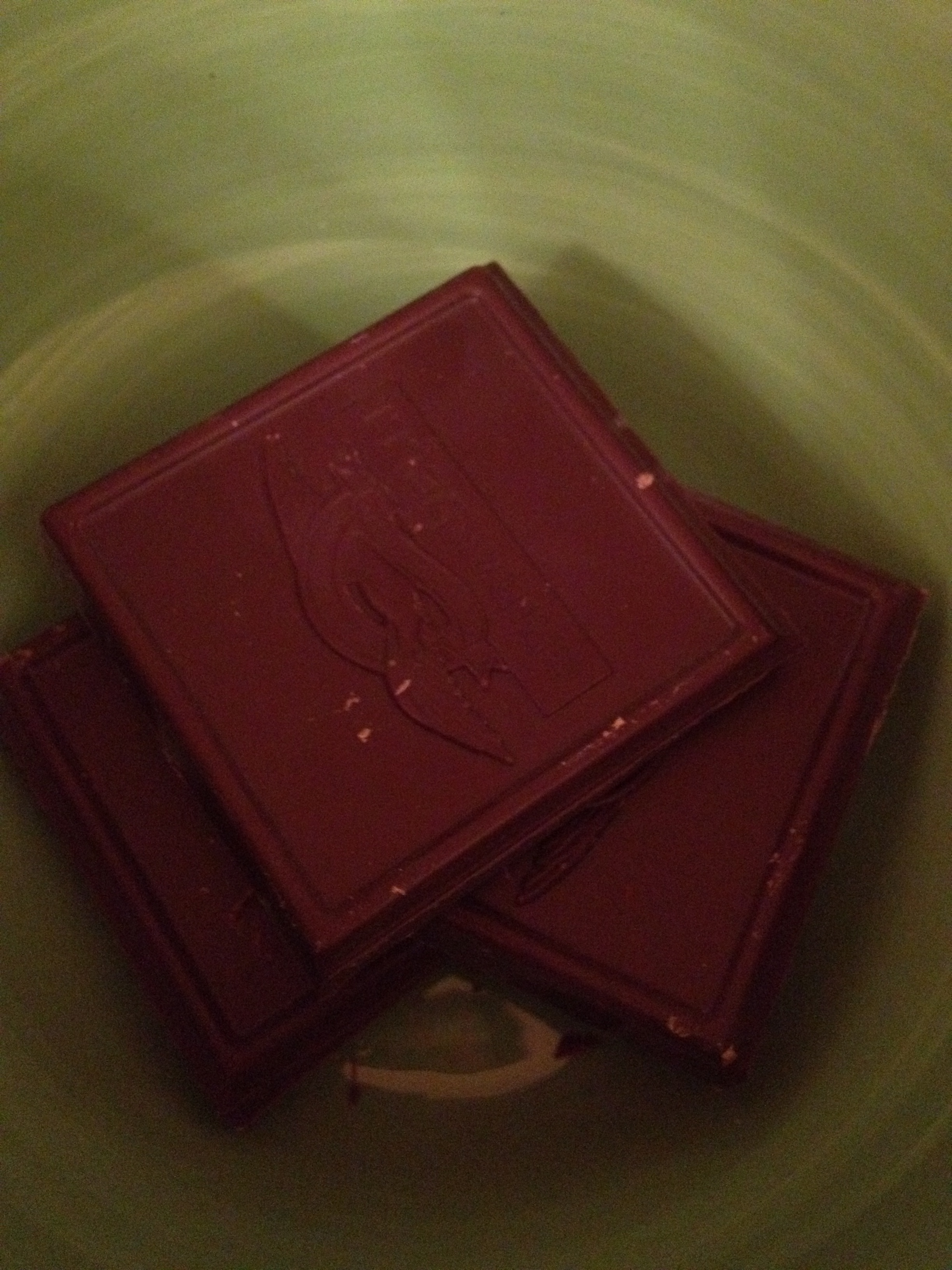 In a microwave safe mug or bowl, break up the chocolate bar and stack the squares in the mug. I usually start with about 3 to 4 squares at a time. Place in the microwave for 30 seconds, and then stir it. Place back in the microwave for another 30 seconds, and repeat stirring. Many notes here! One, the mug gets really hot so have a hot mitt nearby. The chocolate will continue to melt once it’s out of the microwave, so continue to stir it – I even add in additional squares at this point, and they usually melt while I’m stirring the chocolate. It’s important not to overheat the chocolate because it will burn. You can put it back in the microwave but do it for shorter intervals and keep an eye on it.