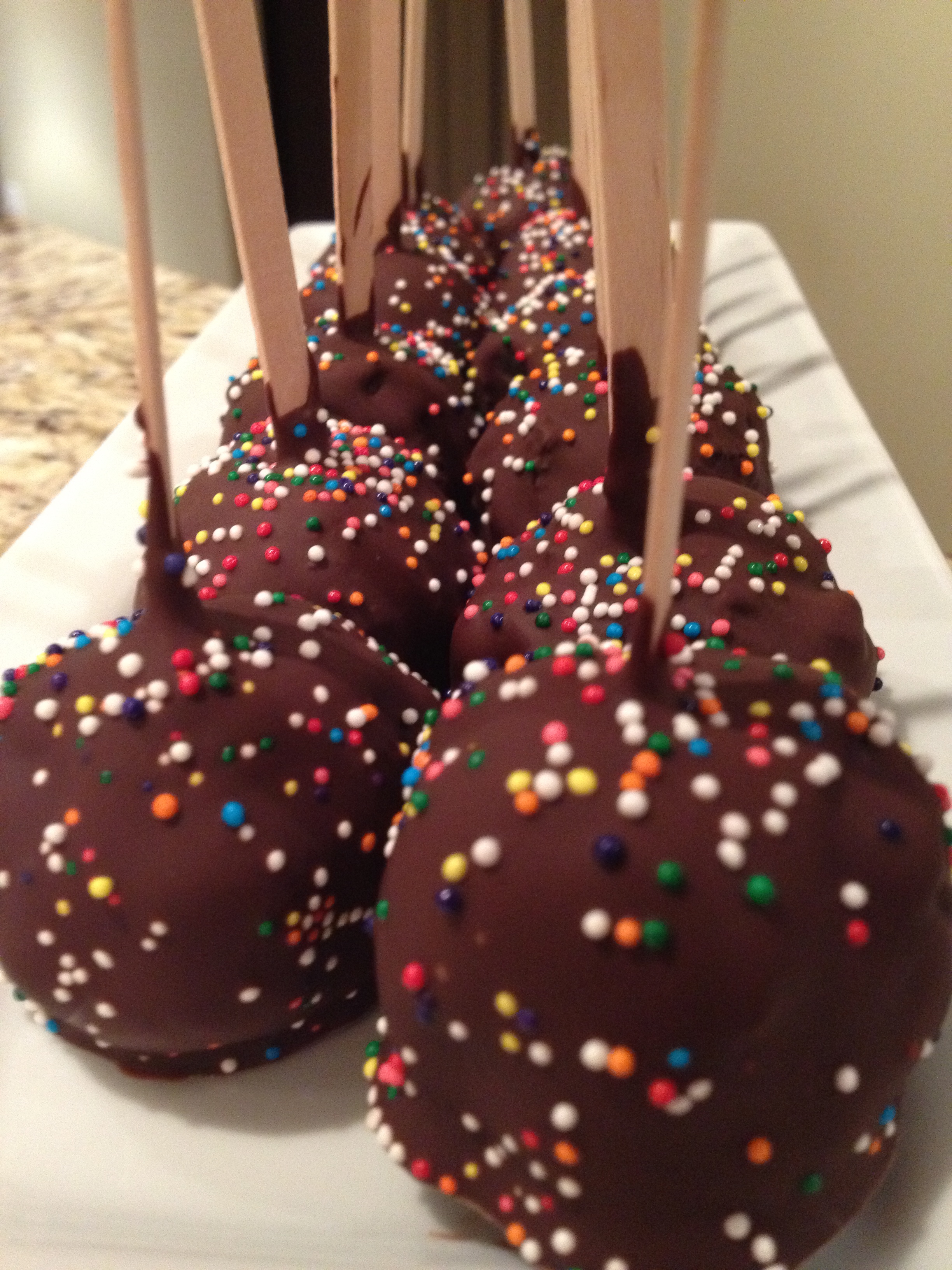 My version is a bit different than most I’ve come across though. One, I use Paul Newman-O’s, which are “healthy” Oreos :). They are lower in fat though, and are made with all organic ingredients. And did I mention that besides Original, they also come in Peanut Butter and Mint Creme? Yum! I also use low fat cream cheese – trust me, these are so decadent, you will not notice you’re missing the full octane cream cheese. Then, I use the best chocolate I can find to melt. I use a combination of milk chocolate and dark chocolate, and then I melt a vanilla bean white chocolate. As for toppings, I’ve used sprinkles, cocoa powder and shaved coconut. I recently have been skipping the sticks as well – I think it looks more elegant on the plate as a truffle, but it does get a bit messier! It’s up to you on how you would like to serve them – either way, they’ll be a hit!