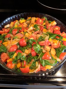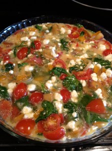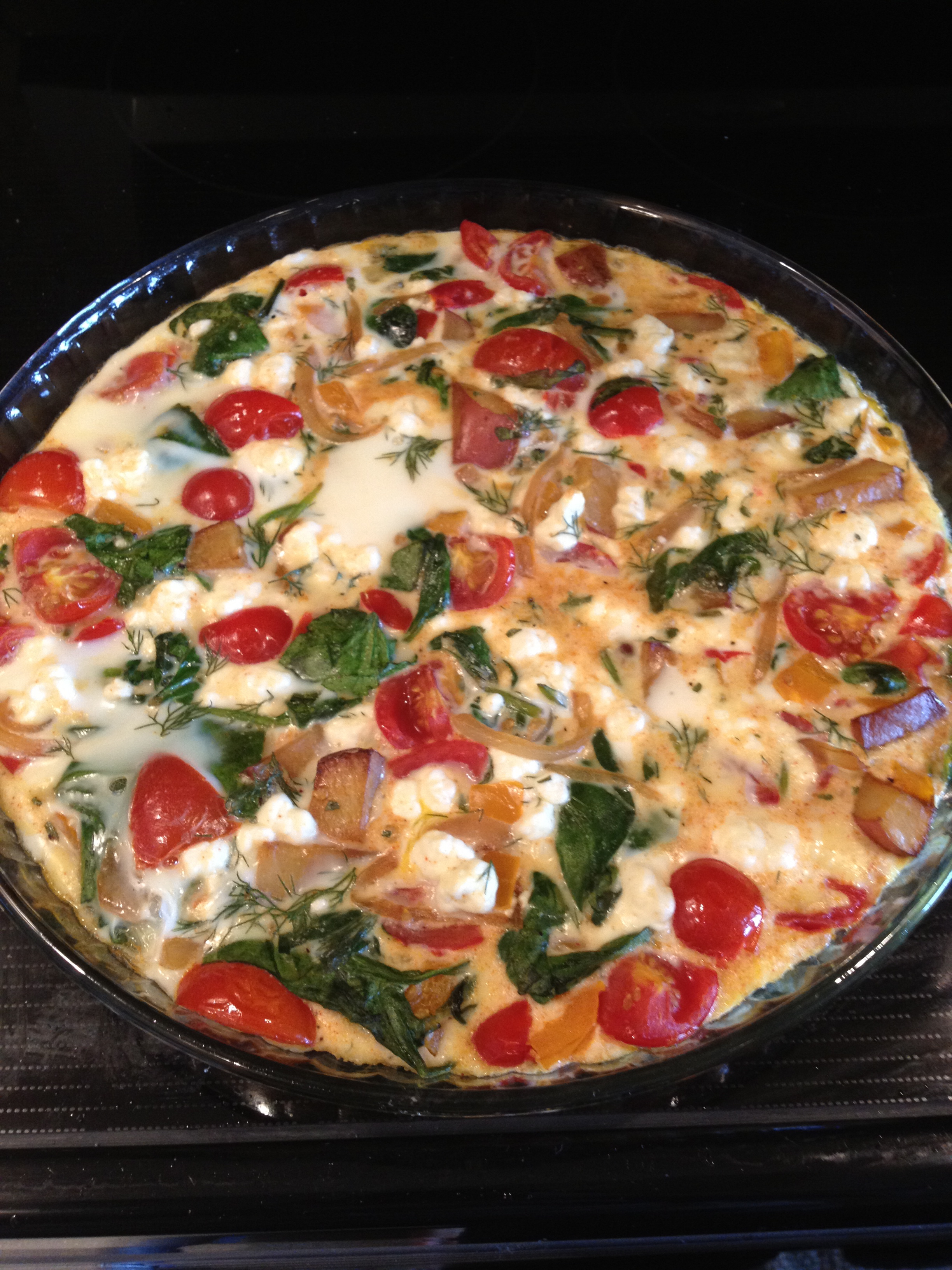 Heat a 12-inch, non-stick pan over medium high heat. Add olive oil to the pan, and then add the onion and the potatoes, sautéing for 10 to 15 minutes. You want the potatoes to brown and soften. Next, add the bell pepper and sauté for a few minutes. Turn down the heat and add the cherry tomatoes and spinach, just long enough to get the spinach to wilt. Turn off the heat, and pour the mixture into a a shallow, greased baking pan. I use a round glass pie dish.
