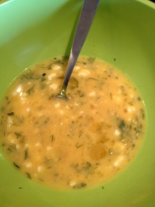 In a medium size bowl, use a fork to blend together the eggs (you can use some whites only if you prefer), a small splash of water or milk, fresh dill, goat cheese, salt & pepper, onion powder and paprika.