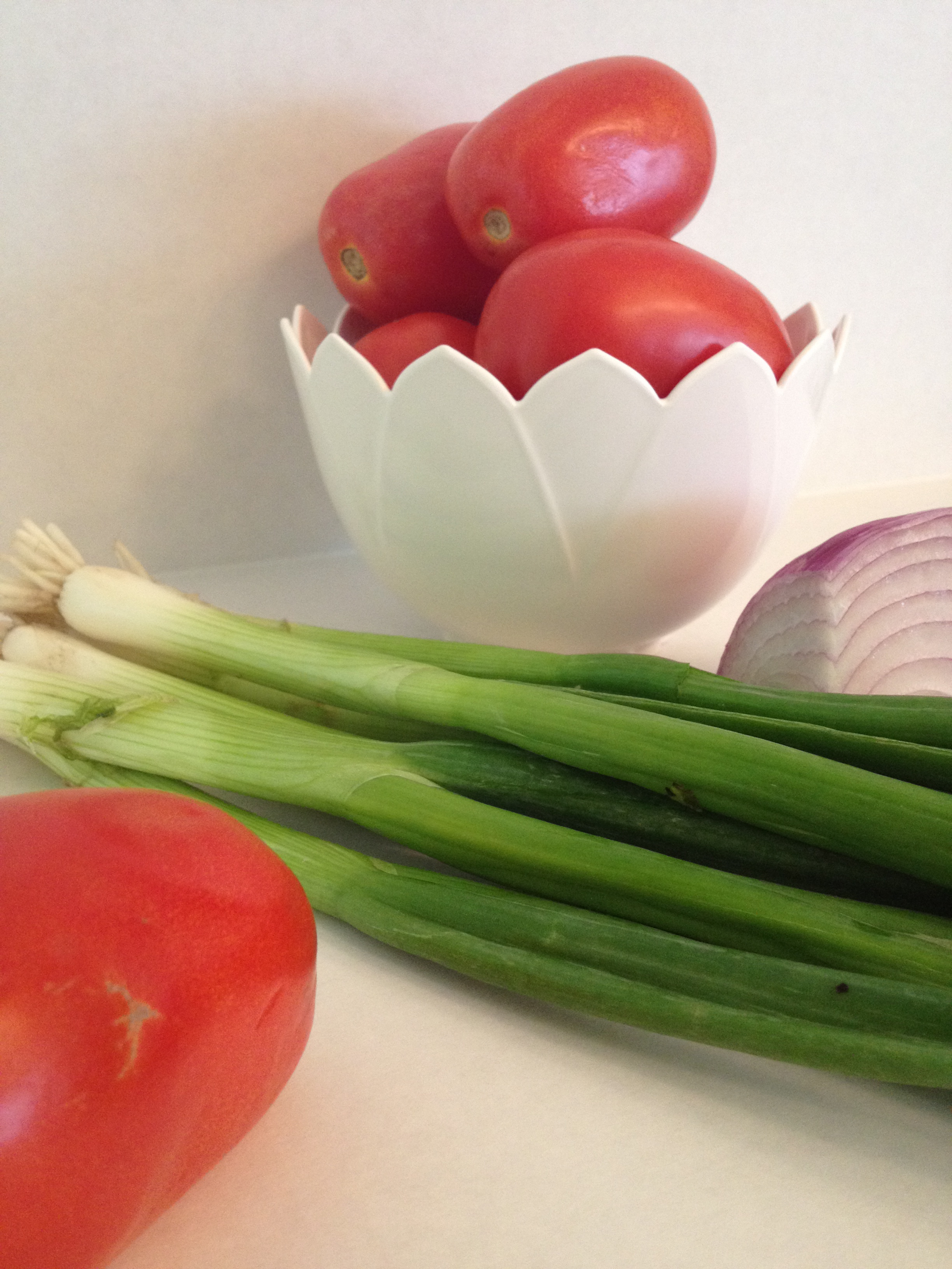 Chop the red onion, green onion, tomatoes, artichokes, garlic, and olives. Set all to the side.