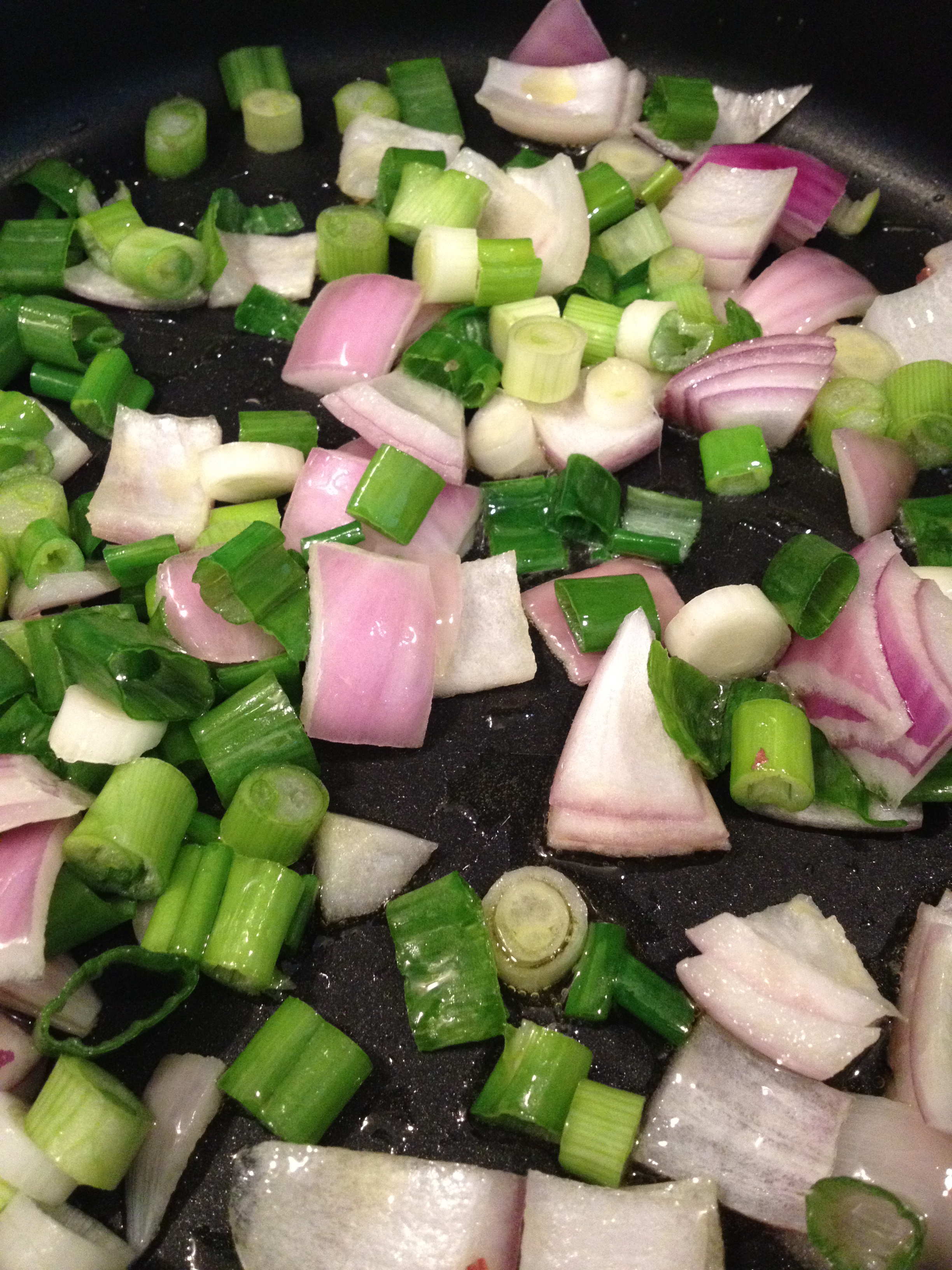 In a large skillet, heat some olive oil over medium heat. Add the red and green onions, sautéing for about 10 minutes. You want them to get soft and translucent, but be sure not to caramelize them.