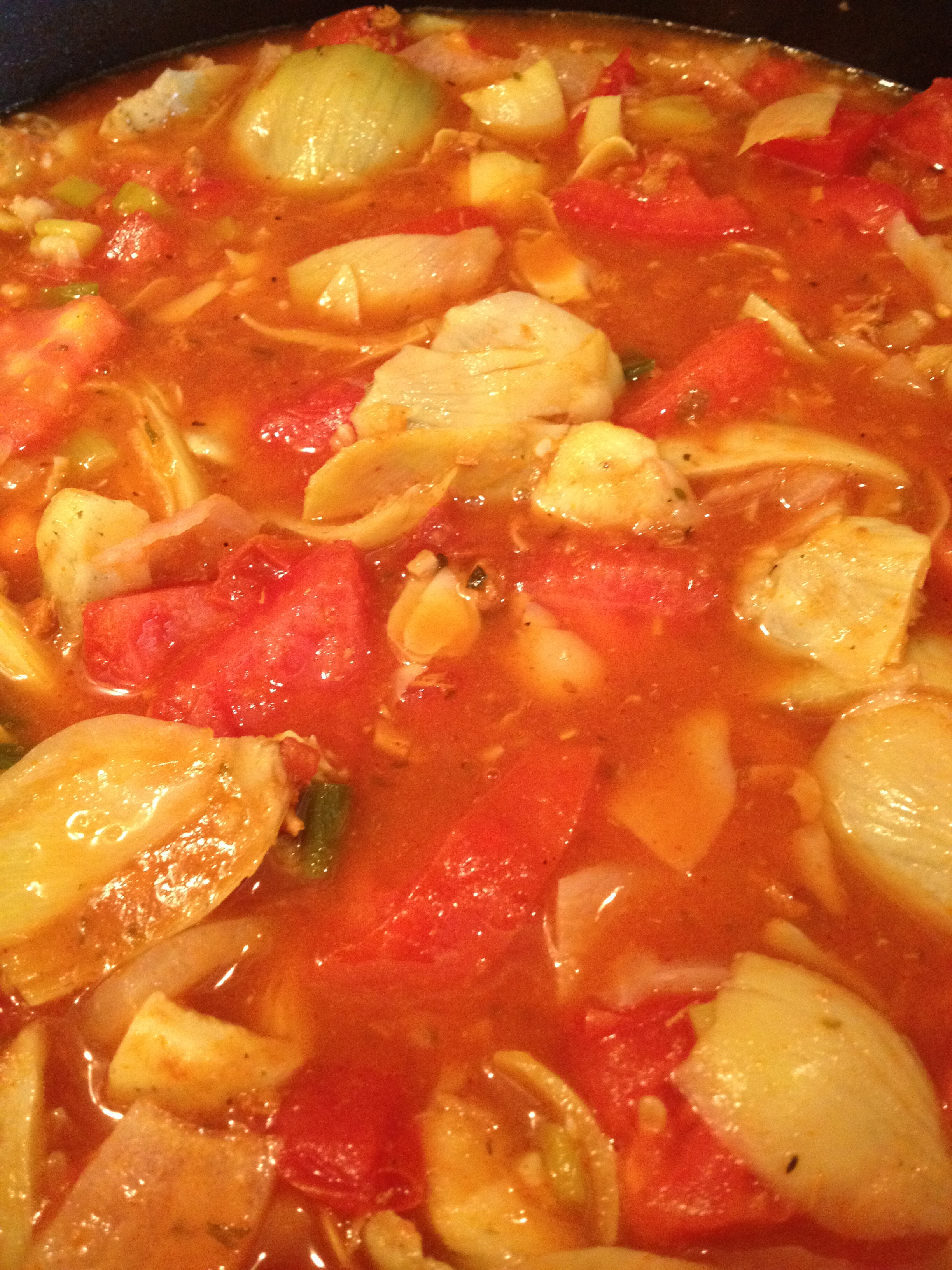 Add the chopped artichokes, tomatoes, white wine, garlic, salt & pepper and let the sauce simmer on a low-medium heat for 15 minutes.
