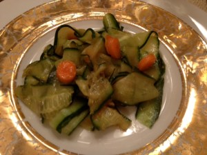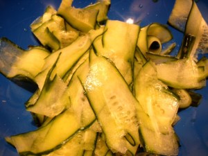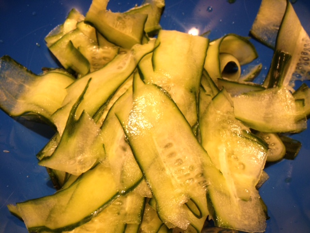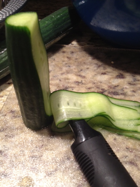 The first time I had this salad was at Jay & Kelly’s – they both were addicted to this ginger dressing and Kelly had come up with the idea for this beautiful salad. By shaving the cucumbers into ribbons, it provides a quick, easy elegance to any plate.