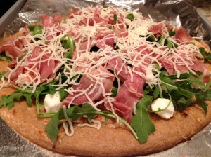 Preheat the oven to 450 degrees. Brush the dough with a generous amount of olive oil, being sure to cover all the top of crust. Spread the mozzarella and 3/4 of the parmesan cheese over the crust and sprinkle lightly with salt and pepper. Bake the pizza until the crust is golden and the cheese is bubbling, around 8-12 minutes. Remove from the heat. Lay the arugula on the pizza, along with the prosciutto slices and the remaining parmesan cheese. Very lightly, drizzle olive oil over the pizza in a quick “z” shape. Place back in the over for a couple minutes – just until the arugula starts to wilt and the prosciutto gets a little crispy. If you prefer, you could serve it without putting it back in the over. Want to jazz it up even another notch? Add dried figs on top, or fig jam under the mozzarella! Serve hot!