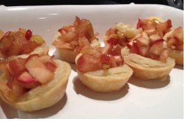 Preheat the oven to 350 degrees. Defrost the frozen pastry dough and set aside. Chop up the applies into small pieces, leaving the skin on. Toss into a large pan over medium heat with the butter, brown sugar, apple cider, and cinnamon. Let simmer until the cider is absorbed and the apples begin to get soft. Take off the heat and set aside.