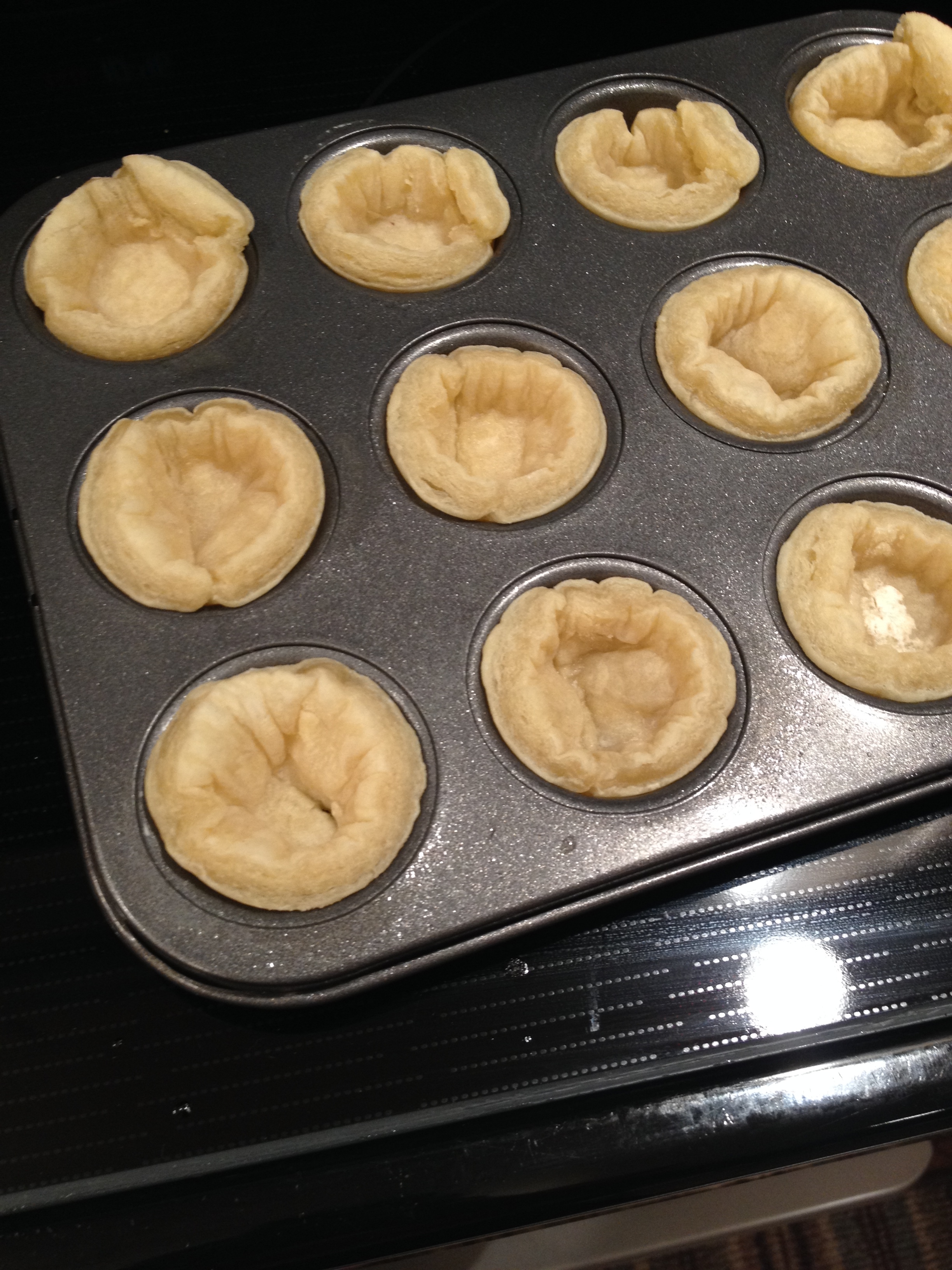 Spray the mini cupcake tin with the non-stick spray. When the dough is defrosted, use a cookie cutter to cut out a circle of dough, just large enough to cover the mini cupcake tin. Carefully push the dough down to create a cup.