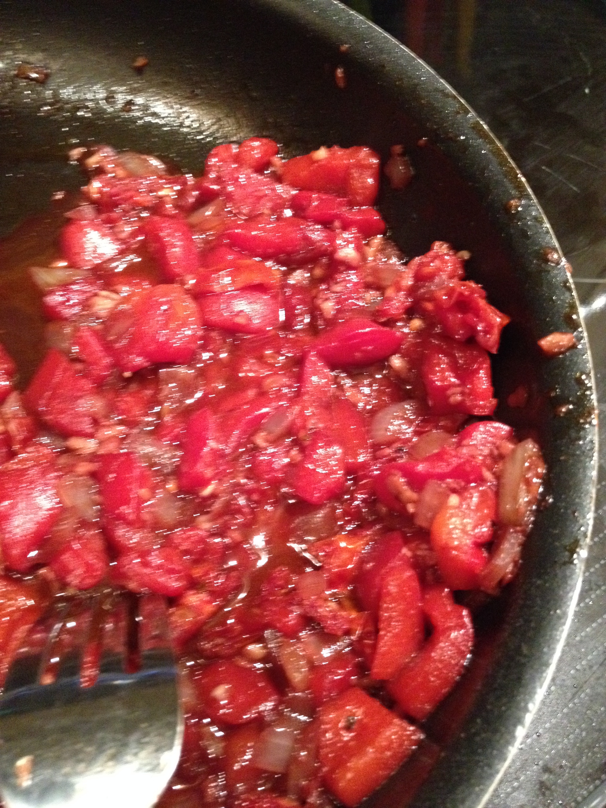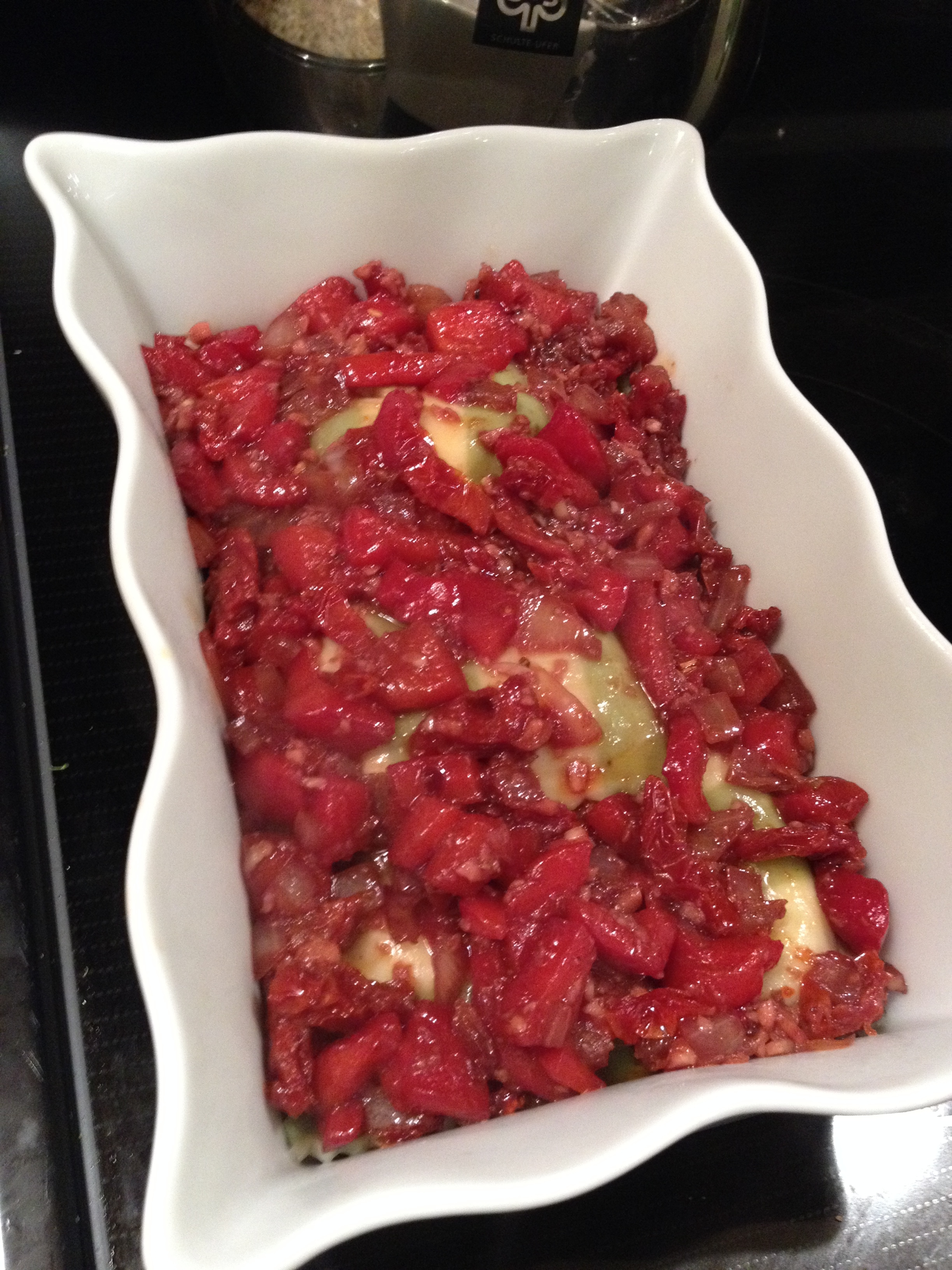 Preheat your oven to 375 degrees. In a large saucepan, sauté the onions in olive oil on medium heat until they start to turn translucent, about 8 minutes. Add the fire roasted tomatoes, diced red peppers, garlic, sundried tomatoes, red wine and red pepper flakes. Let the mixture simmer on a low-medium heat for about 15 minutes, allowing the flavors to blend.