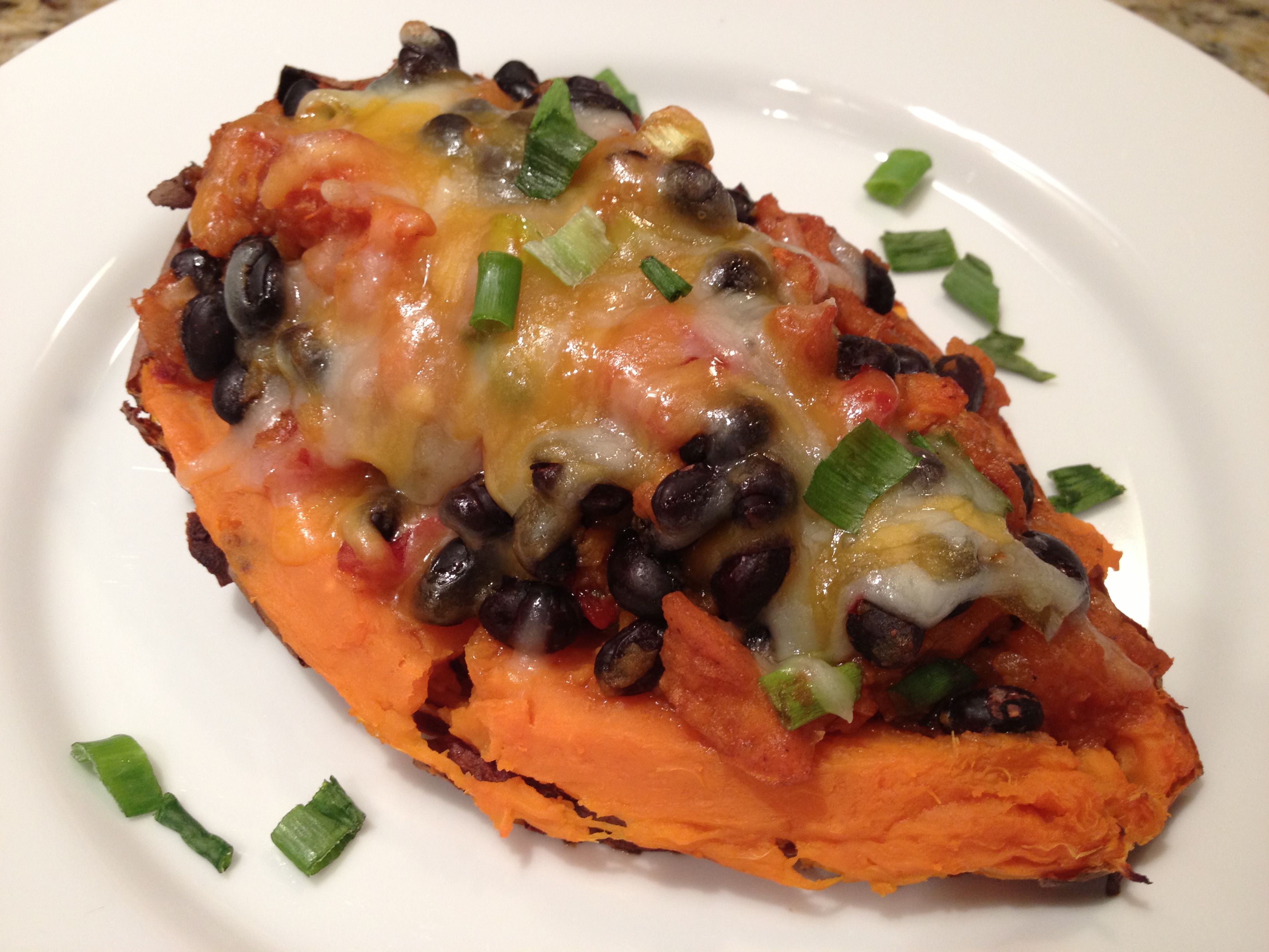 Mix the flesh of the sweet potatoes with the greek yogurt, pepper jelly, cumin, red pepper flakes and salt. The potatoes are usually soft enough to just use a spoon, but you can use a mixer if needed. When well-mixed, gently stir in the black beans, and sautéed onions & peppers.