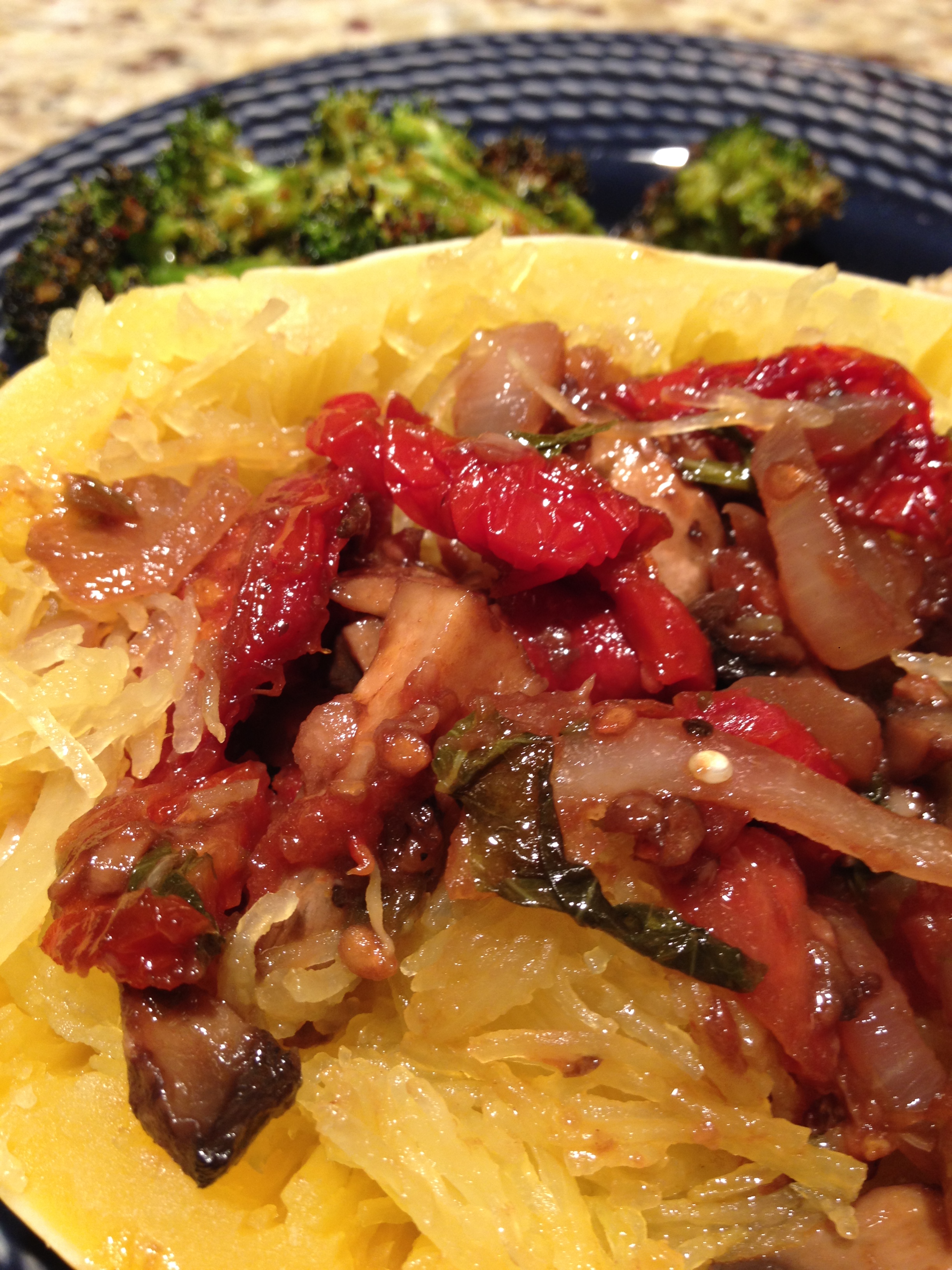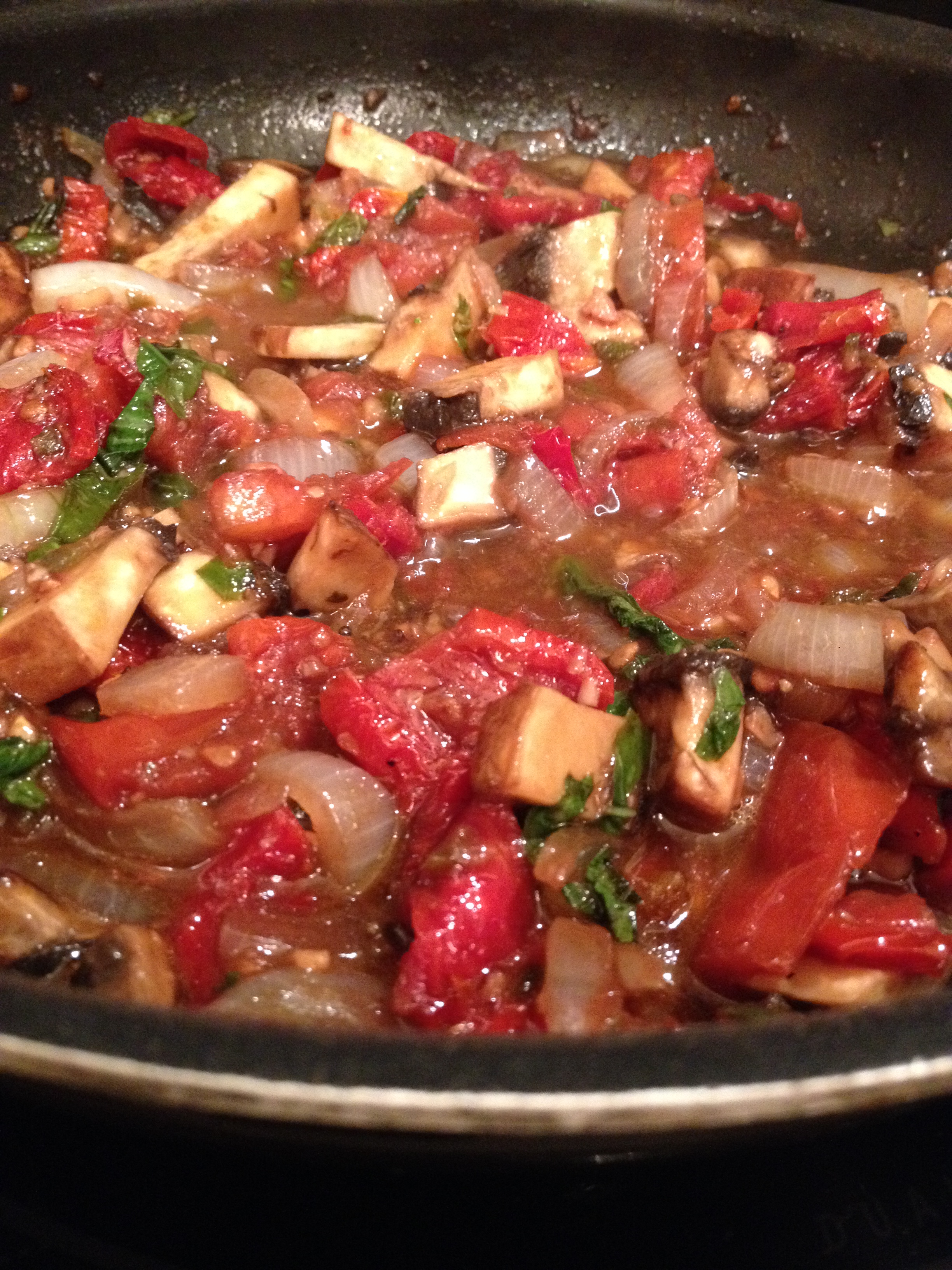 While the squash is cooking, sauté the onion in a sauce pan on medium heat with the olive oil. When it starts to turn translucent, add the sun dried tomatoes, fresh tomato and garlic. Let simmer for 5 minutes and then add the red wine and balsamic. Let the mixture continue to simmer for another 10 minutes and then add the portobello mushrooms and fresh basil.