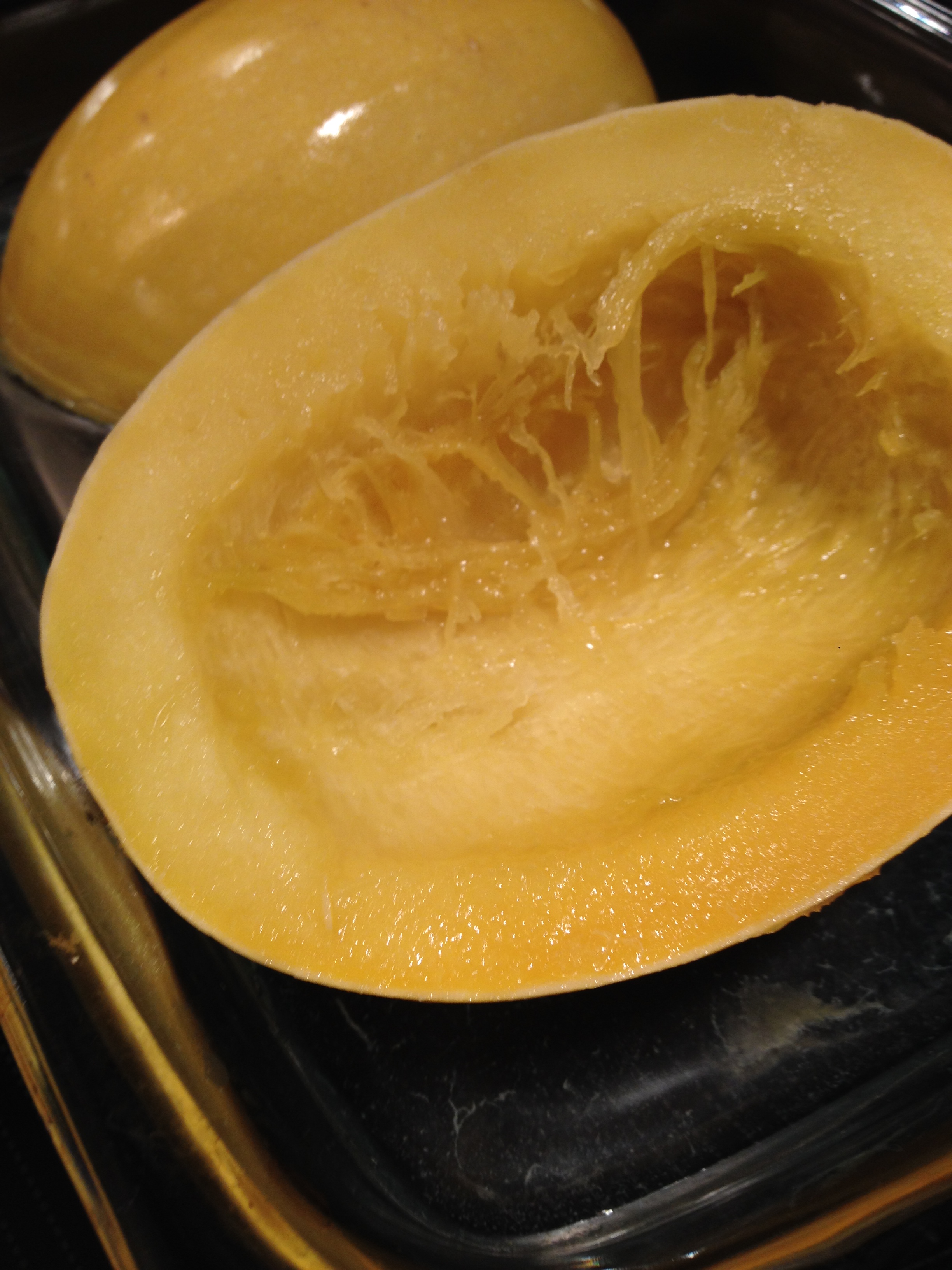Preheat the oven to 375 degrees. Slice the Spaghetti Squash in half, length wise. Scrape out the seeds and place the squash skin up in a glass baking dish with a half inch of water. Bake for 40 minutes. The flesh will string apart with a fork when done.