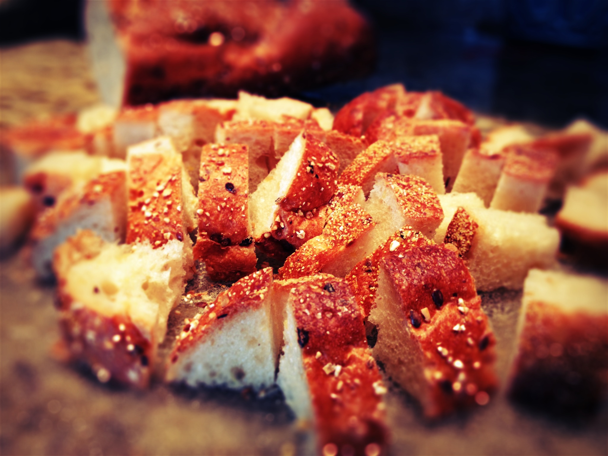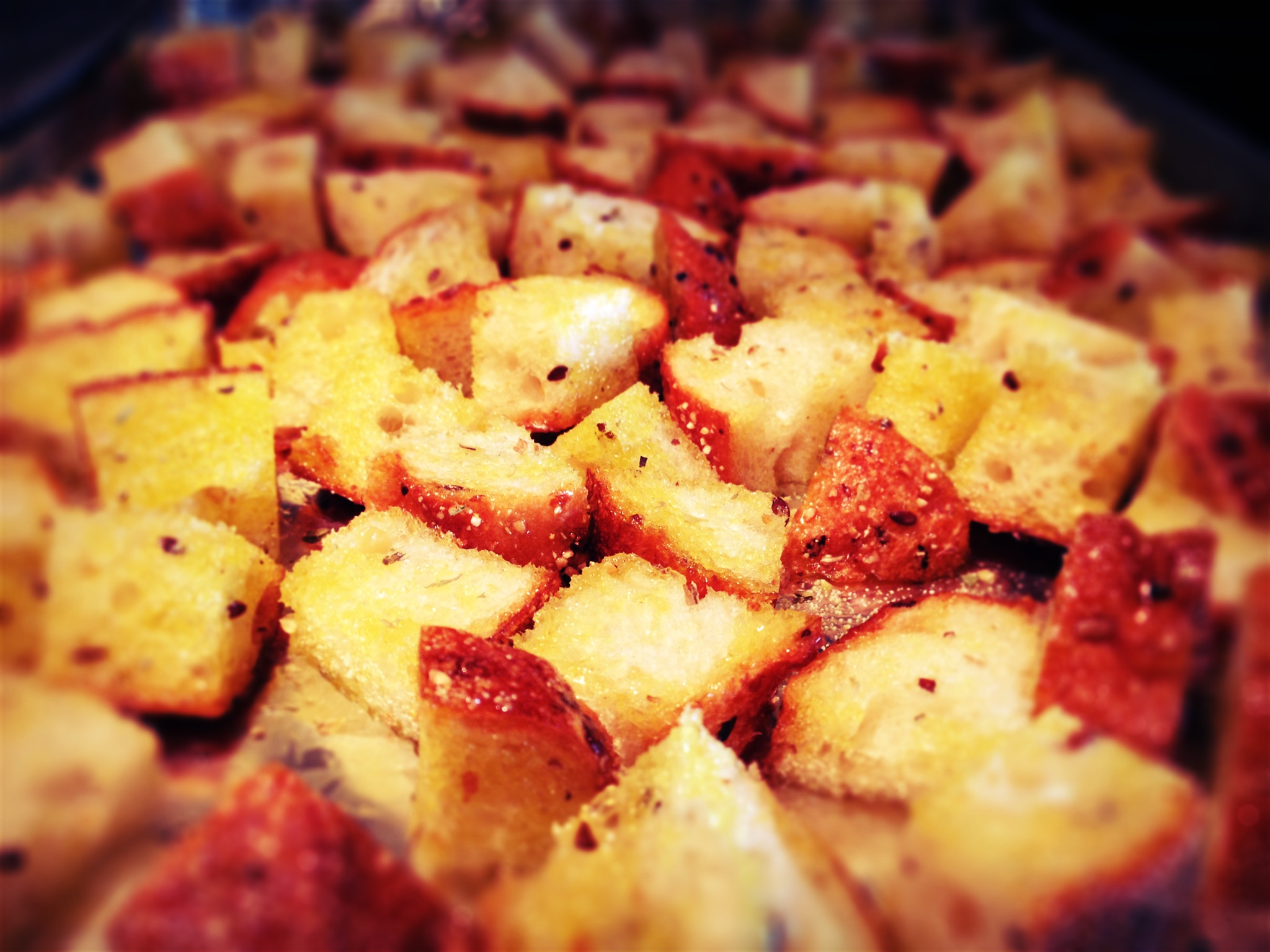 Toss all the diced bread into a large bowl. Pour the oils and spices onto the bread, and mix well until all the bread pieces are covered. Adjust amount of oil and spices as needed. Remember to always start with smaller amounts – you can add, but it’s pretty much impossible to remove oil already soaked into bread!