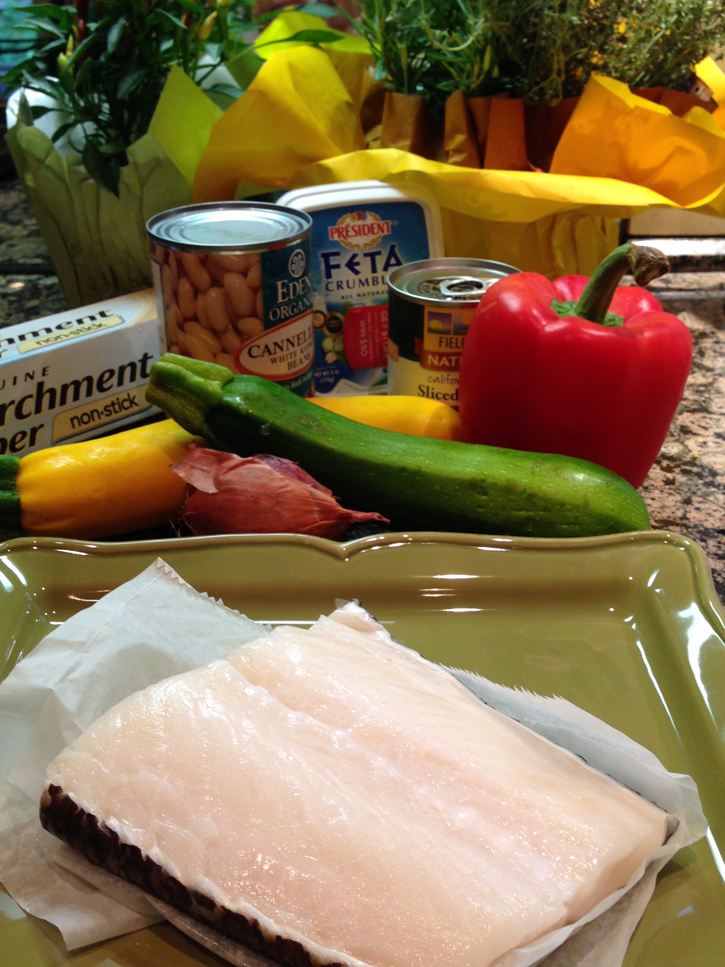 Layer parchment paper followed by northern Italian beans, spinach, veggies, fish, seasoning, feta cheese and olives. Drizzle lightly with olive oil. Wrap parchment up tight. Cook for about 20 mins depending on fish size.