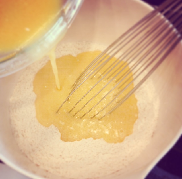 Melt butter in a small saucepan over moderately low heat, then remove from heat. Whisk in milk, then whisk in eggs and vanilla extract until combined well.