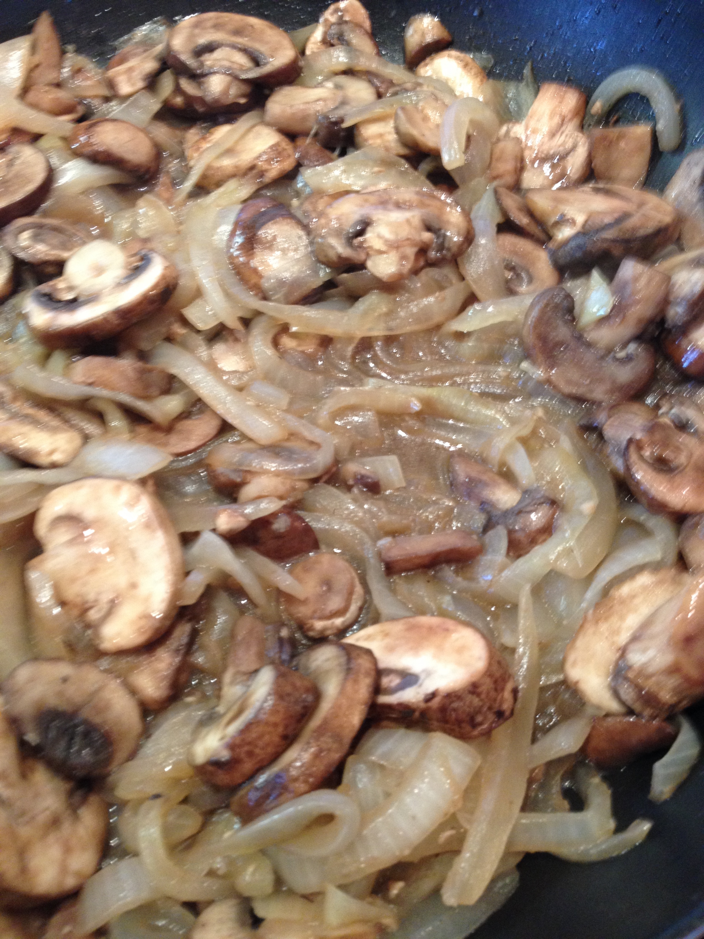 Heat a skillet over medium-high heat and melt the butter with a couple drizzles of olive oil. Add the slivers of onion and cook until slightly caramelized. Reduce the heat to low and add the minced garlic and mushrooms. Cook until the mushrooms get slightly soft – remember you’ll be baking it again later so you don’t want them to get too soft. Add a splash of the balsamic vinegar over the mushrooms for the last 30 seconds of cooking. Set aside to cool.