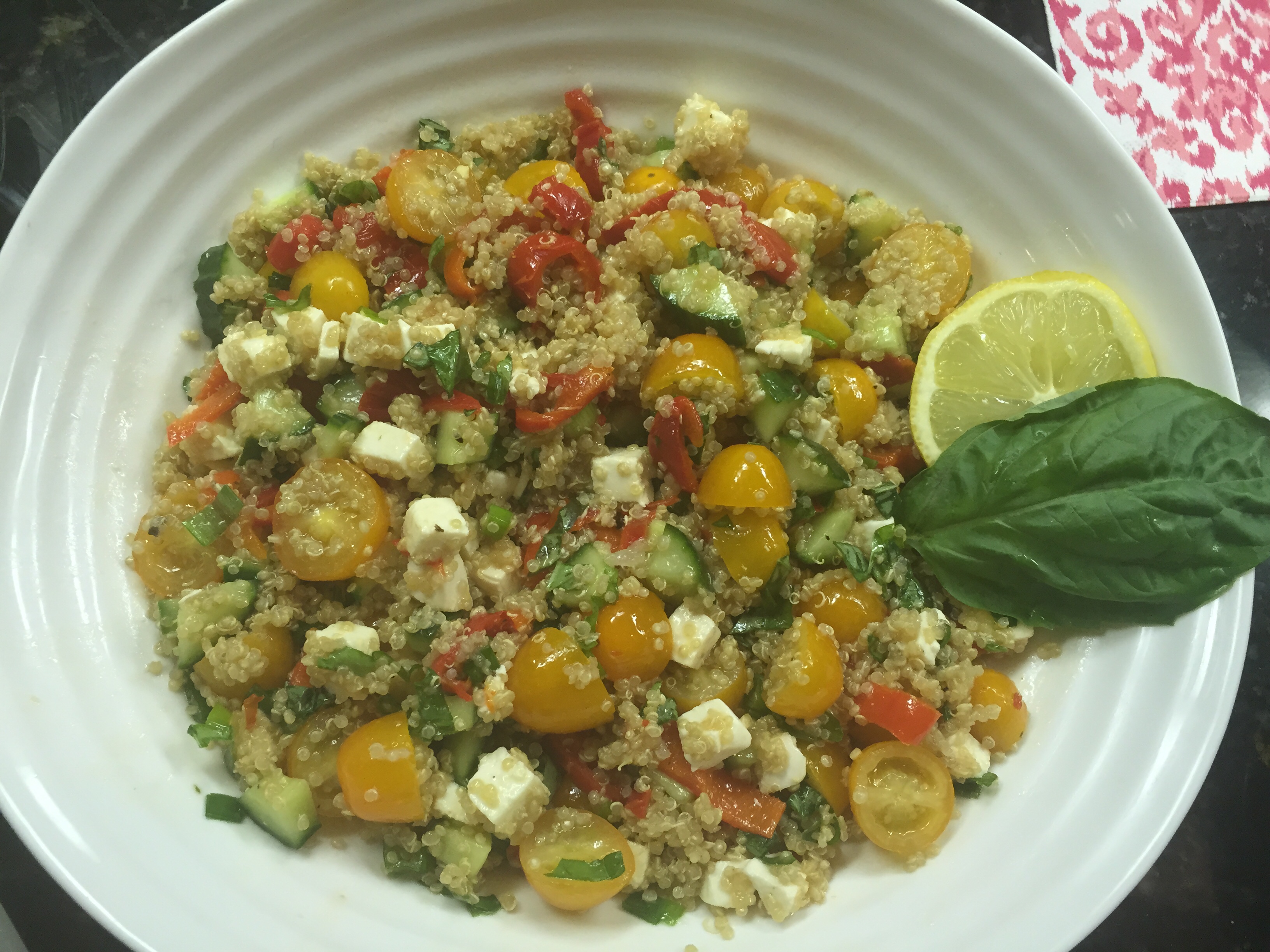 The days are getting longer, the sun is getting warmer, and families are gathering for summer weekends on the water. Embrace the fresh summer flavors with this healthy dish that can be made in advance. Playing with the classic flavors of a Caprese Salad – tomatoes, basil, & mozzarella, this dish is enhanced with the addition of roasted red peppers, cucumber and a fresh lemon juice dressing. The salad could be served with no grains, but the quinoa adds not only substance for a crowd but a nice slightly nutty flavor to balance the vegetables and the acidity of the dressing.