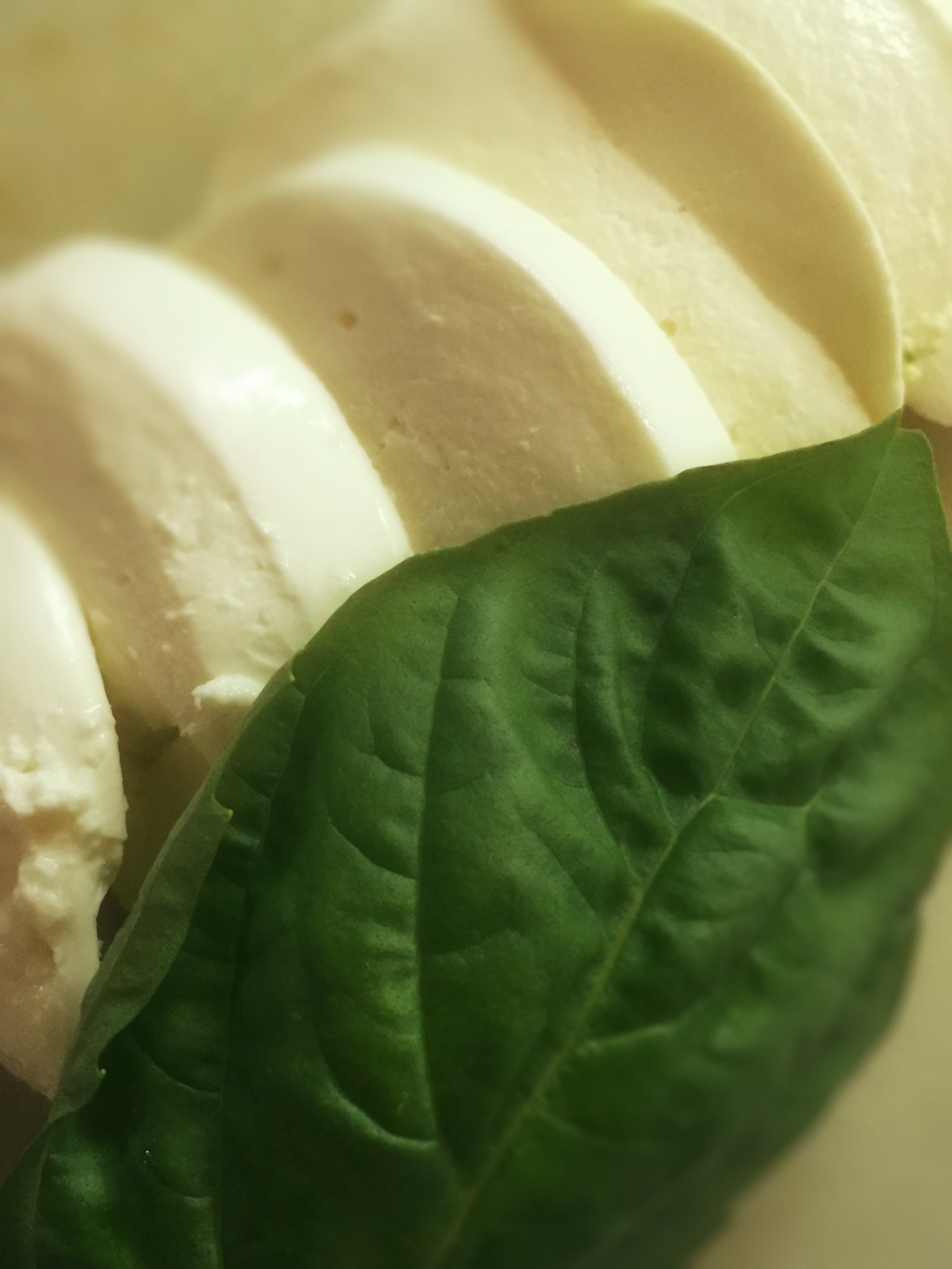 Cut up the fresh mozzarella into bite size pieces, and mix in the bowl. Pick several fresh basil leaves, and stack them on top of each other. Roll them up into a log, and then cut the log on a perpendicular angle to get long strips of the basil. Mix into the salad.