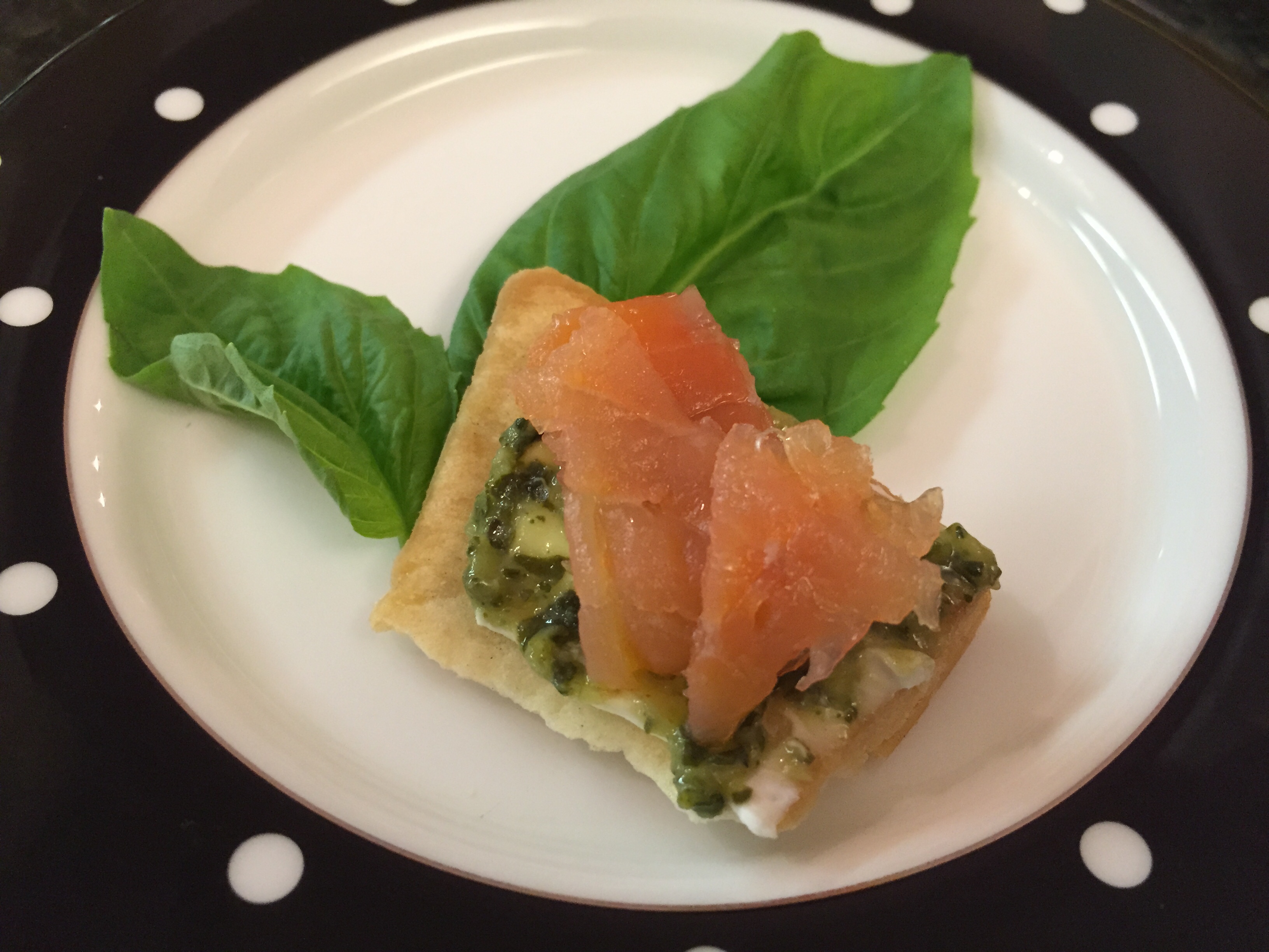 Spread cream cheese on each cracker, then top with the pesto and sliced smoked salmon. Serve immediately. So simple, yet packed with so much flavor.