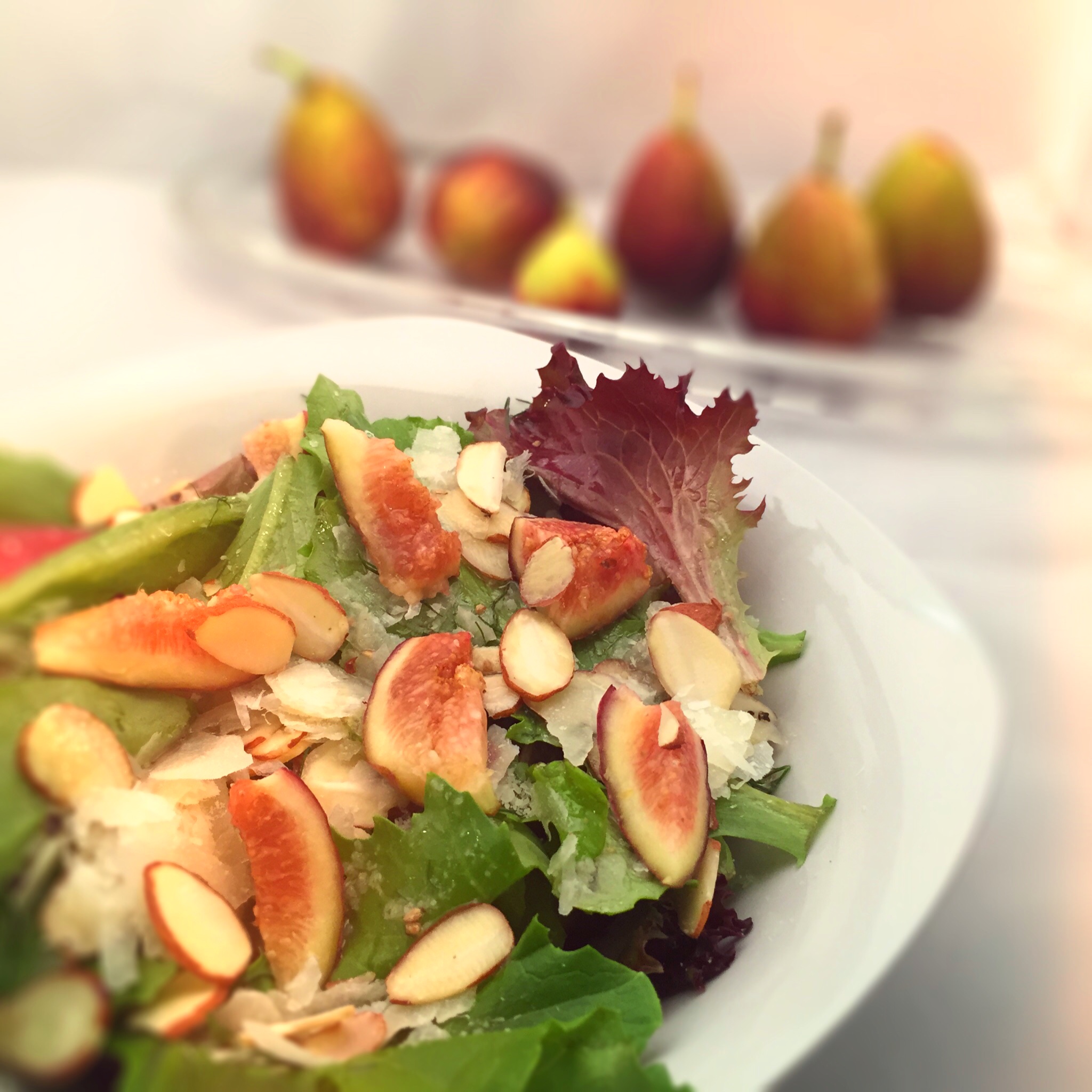 In a large bowl, add the mixed greens, shaved parmesan, sliced almonds, and fresh dill. Add the dressing to your liking, and season with salt & pepper. Trim the tops off the figs, and cut into quarters. Toss into the salad and enjoy!