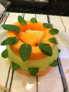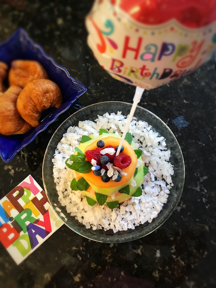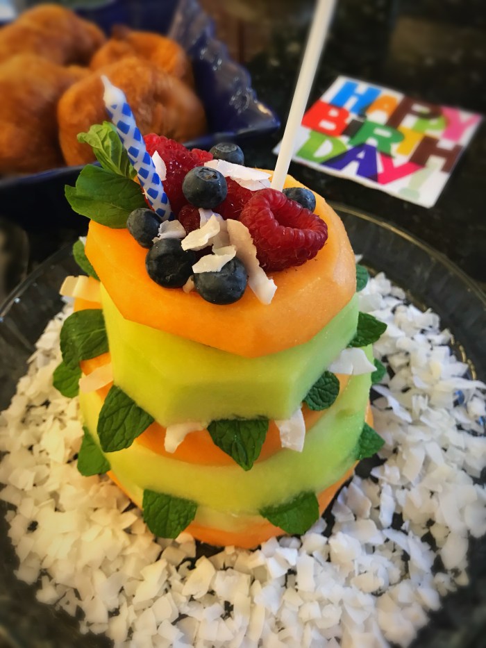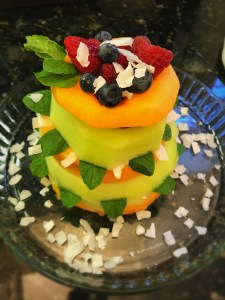 Once the cake is to a desired height, fill the interior hole with excess slices of melon. Top the cake with the end of one of the melons that has the cupped cavity. Fill the cup with the fresh berries, a sprig of mint leaves and drizzle with the shaved coconut. Decorate the platter with the rest of the coconut and berries. Top the cake with a candle and let the birthday celebration begin!