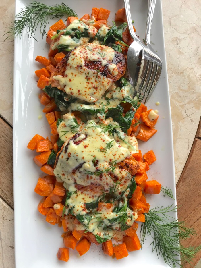 While on our honeymoon, we had the amazing luxury of having a chef come to our rented condo to cook us brunch. He was an inspirational chef- not only did he share his most incredible cooking skills with us, but also his story of being plucked from a high school dish-washing job into a world-class cooking apprenticeship. He was so grateful for the opportunity his first boss provided him; a ticket to a new world, with paths for career development and a new life trajectory. With his dedication to his career, and always taking advantage to learn from others, he has collected a wide variety of flavors & styles from all over the world. When he travels, he offers to be free-labor in local restaurants to learn from them. Amazing, right? One of the dishes he served us was a smoked paprika & maple syrup roasted salmon & topped it with a dill hollandaise. He served the salmon with steamed spinach and the most amazing sweet potatoes. He was kind of enough to share his cooking technique, which I am now sharing with you. I know he had a special touch that made them even more delicious, but they’re still so good! The outside edges of the potatoes have a bit of a crisp while the center is smooth and creamy. Absolute perfection.