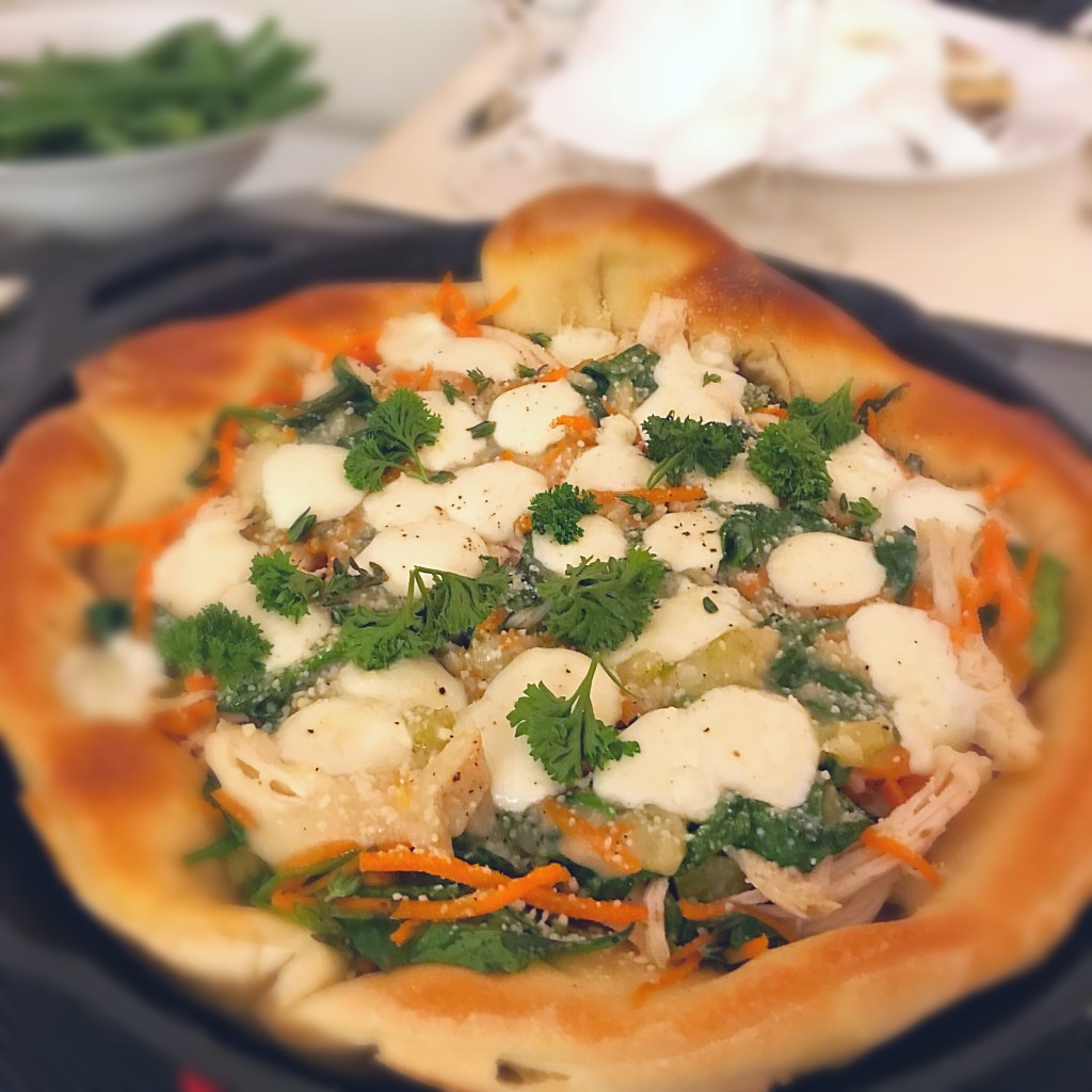 Remove from the oven, and then top the pizza crust with 1/2 cup of the stock mixture and 1/2 of the parmesan cheese, spreading it over the base of the crust. Next add the vegetable mixture, chicken and the remaining parmesan & mozzarella cheese. Cook until the cheese is melted & browned, about 8 minutes. Once melted, remove from the oven and drizzle the remaining stock mixture over the vegetables and chicken. Sprinkle with the remaining thyme, parsley, salt & pepper. Serve hot to warm the belly & soul.