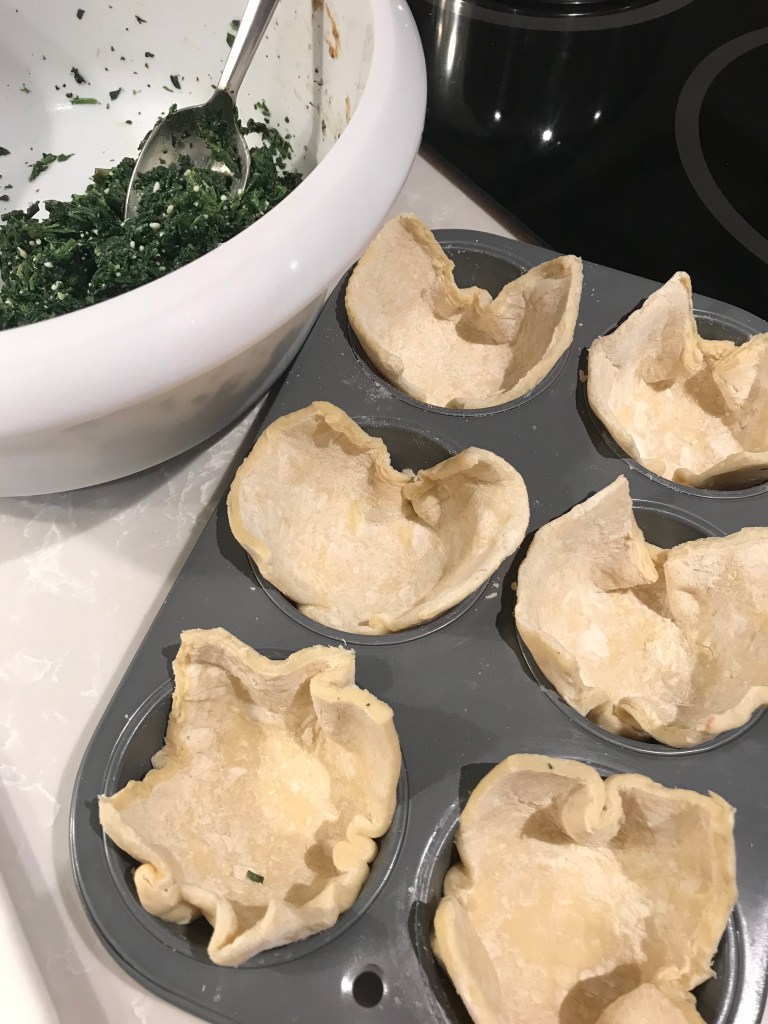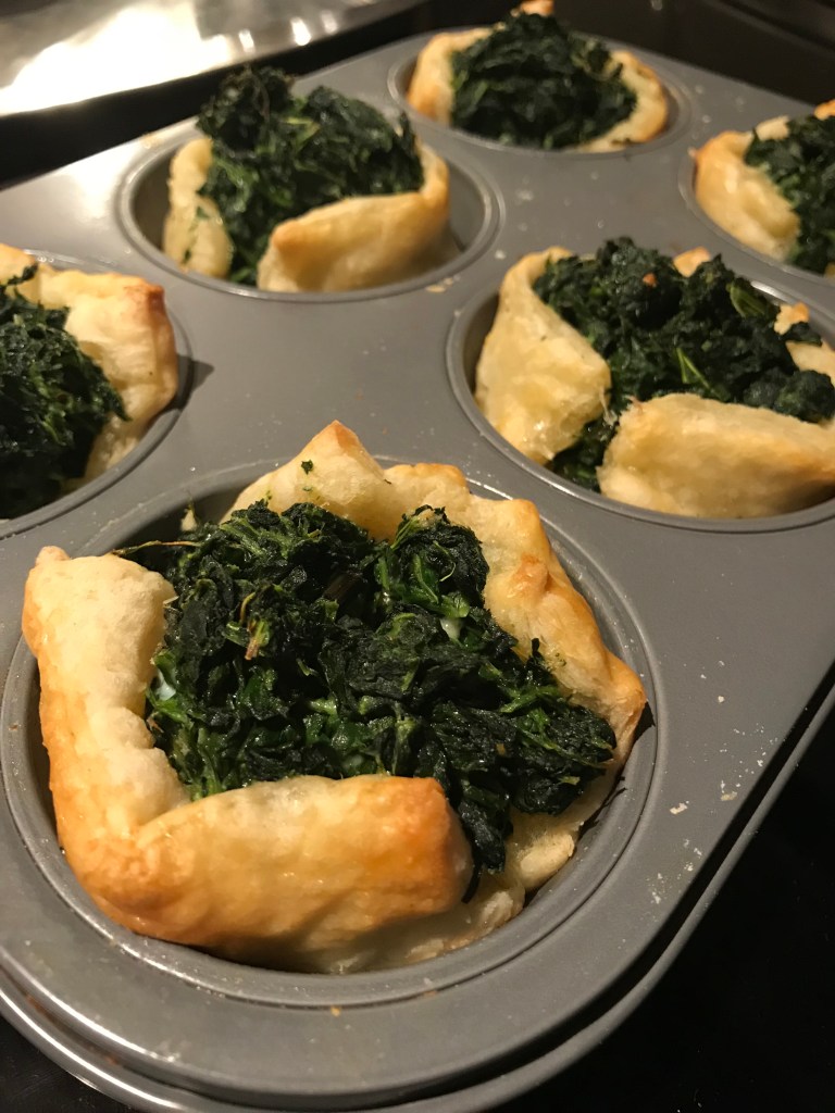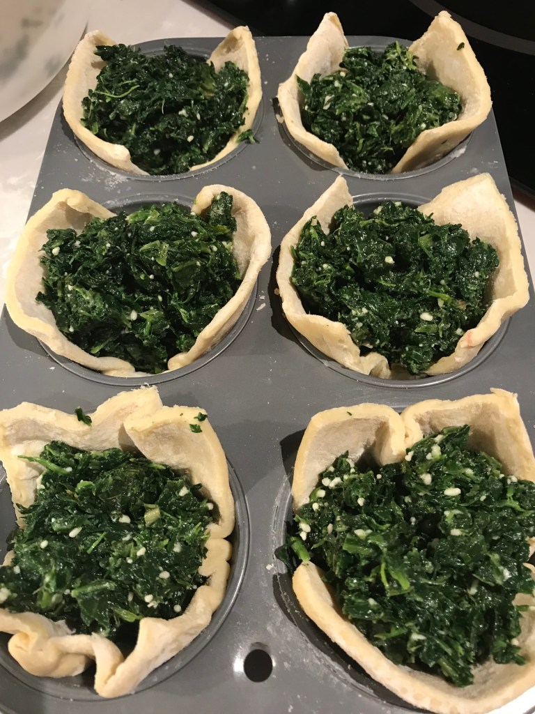 Butter the muffin pan and set aside. After the frozen puff pastry has been defrosted, cut the dough into 6 equal squares. Place a square of puff pastry into each muffin cup, pressing carefully into the bottom of the cup, but leaving the corners pointing up. Fill each cup with the spinach filling. The spinach cups can be made up until this point, and refrigerated (covered) for up to two hours.