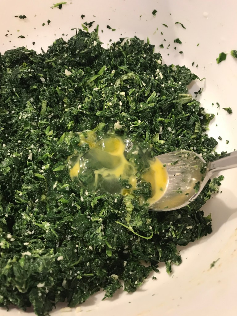 Preheat the oven to 400 F. Defrost the frozen puff pastry and the frozen spinach. Squeeze the water out of the spinach as too much water can make the dough soggy. In a mixing bowl, mix together the spinach, cheese, olive oil, mustard, basil & garlic. Season with salt & pepper. In a small bowl, beat 1 of the eggs, and then fold it into the spinach mixture.
