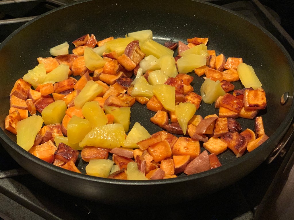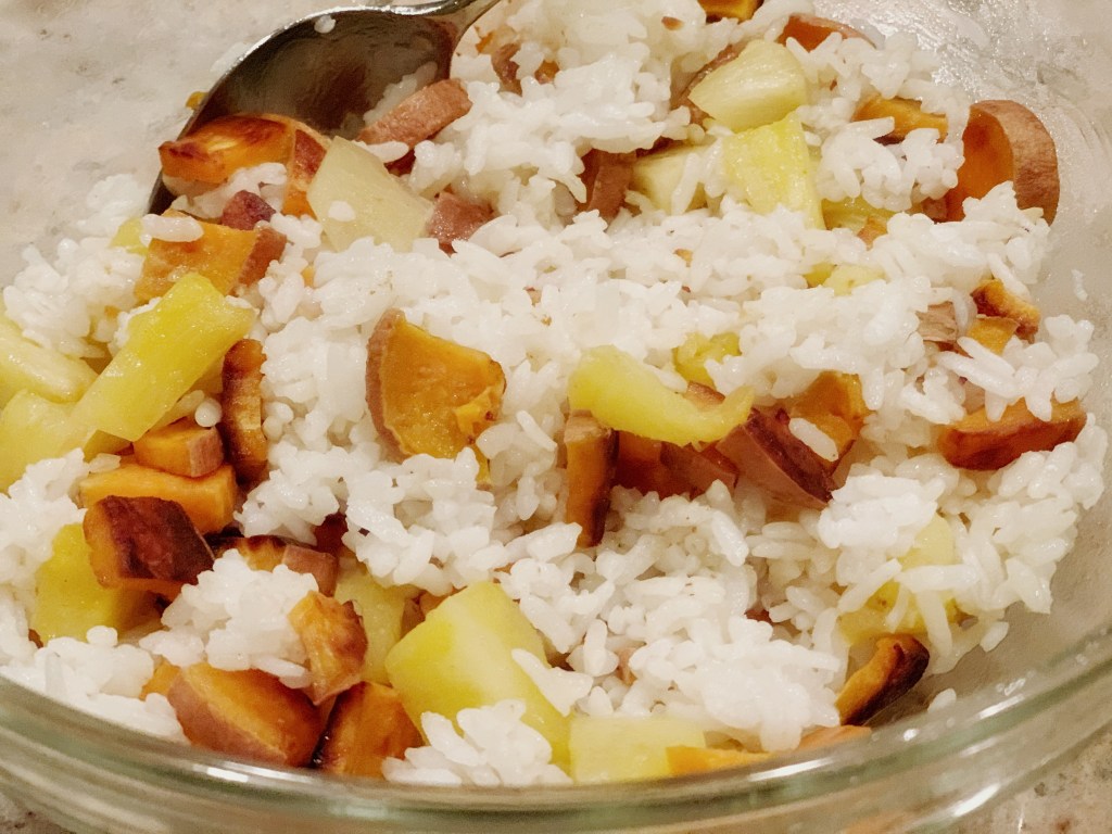 Cook the white rice as per the products instruction. Cut up the sweet potato into small pieces and then sauté in the coconut oil over medium heat. Let them brown a bit, but not burn. Turn down the heat and add the pineapple. (I usually find the frozen chunks are a bit big, so I cut them down into bite-size pieces.) Cook over low heat for a few minutes. Once the rice is done, mix all the items together and season with salt. Serve with fish or chicken.