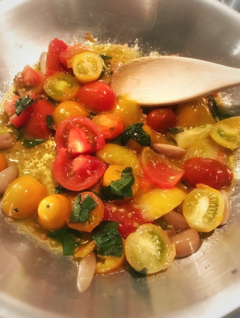 While the pasta is cooking, drizzle half of the olive oil in a medium-sized sauté pan over medium heat. Add the sliced tomatoes and gently turn them on occasion, ensuring they are cooking evenly. As they begin to soften & release their juices, turn down the heat to low and add the minced garlic. Be careful to not burn the garlic. Season with salt & pepper. Next, add some of the freshly cut basil.