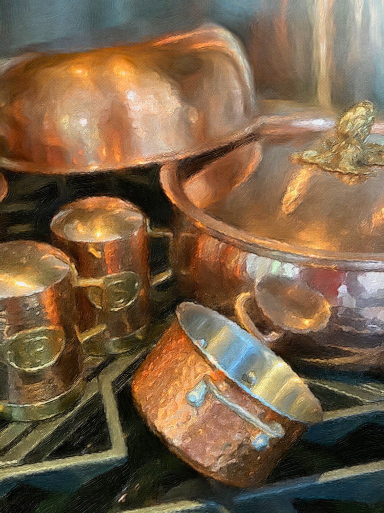 Copper pots are considered one of the crème de la crème of cookware. They are beautiful, casting that golden hue across the kitchen, personifying a classic, elegant way of old world cooking. I am the fortunate recipient of my grandmother’s old copper cookware, in addition to some very generous wedding gifts. I love cooking and entertaining with our copper pieces. The older cookware hold tradition, and we are creating new memories with each additional use of all our copper. Not only is it beautiful, copper is one of the best conductors of heat, evenly distributing the heat through your food. I tell you, a watched copper pot does boil! When cooking though, you do not need extreme heat – keep a moderate flame and let the copper work it’s magic.