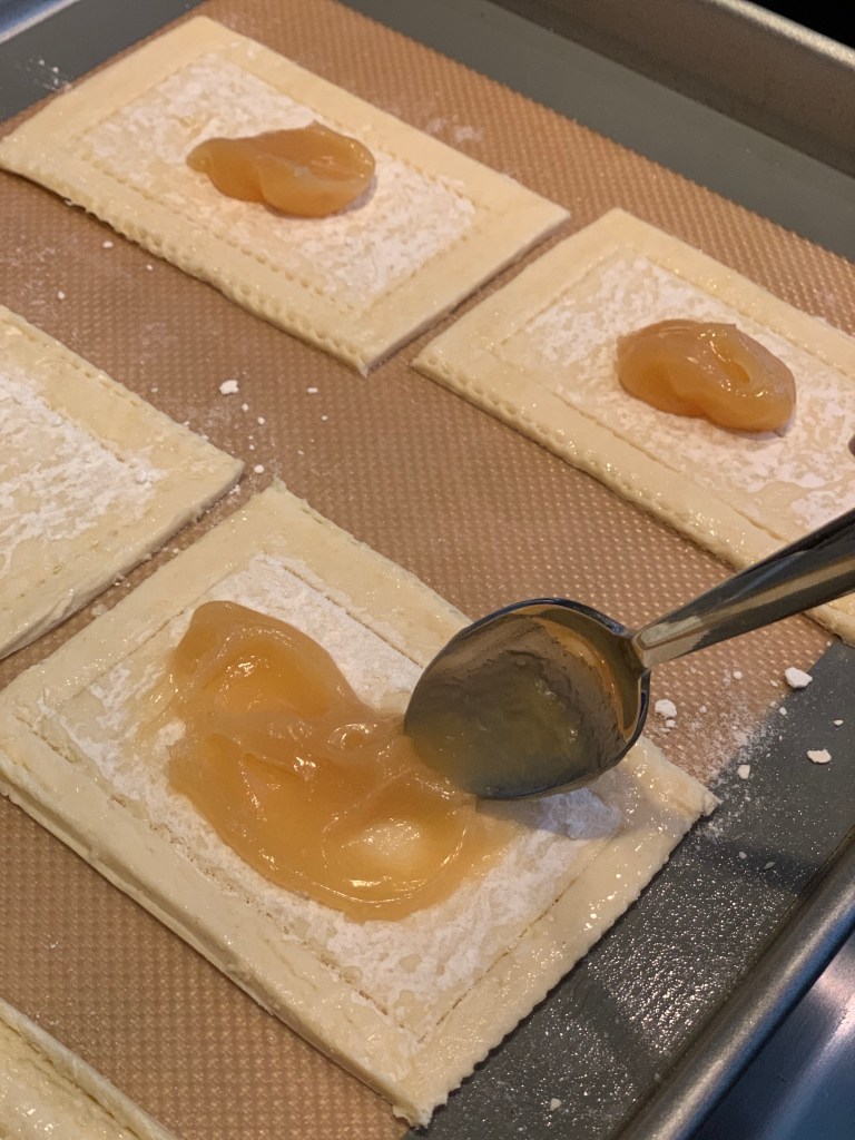 Preheat the oven to 400 degrees. Defrost one sheet of frozen Puff Pastry as per the instructions on the box. Place the pastry dough on a large baking sheet lined with parchment paper or Silpat. Slice the dough into six equal sized rectangular pieces, spacing them at least 1-inch apart.