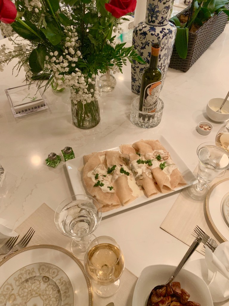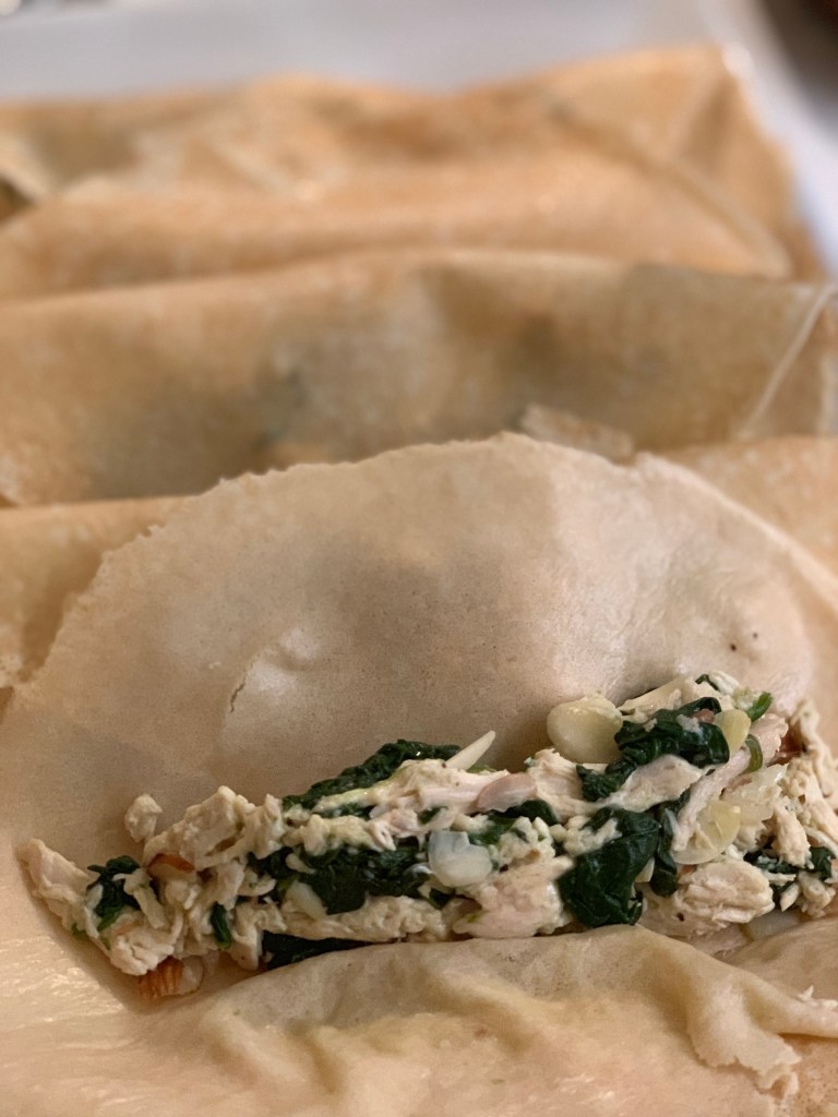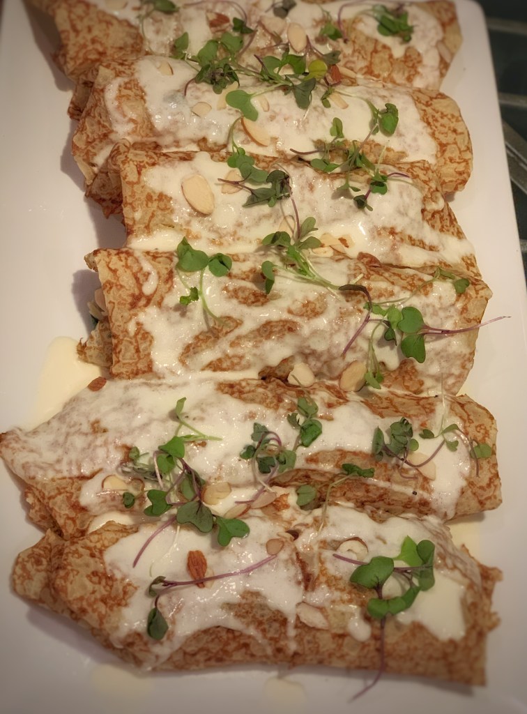 My husband loves crêpes. Sweet or savory, chances are if it’s on the menu, he’s ordering it. I had never made a savory crêpe until I adapted this modified version from a recipe I came across on Pinterest. Wow. So flavorful and fairly easy to prepare. The hardest aspect of this recipe is keeping the crêpe from tearing since it is so delicate. The lemon adds a freshness and contrasts nicely with the cream sauce. While the dish should be served upon putting everything together, the stuffing can be made in advanced and reheated.