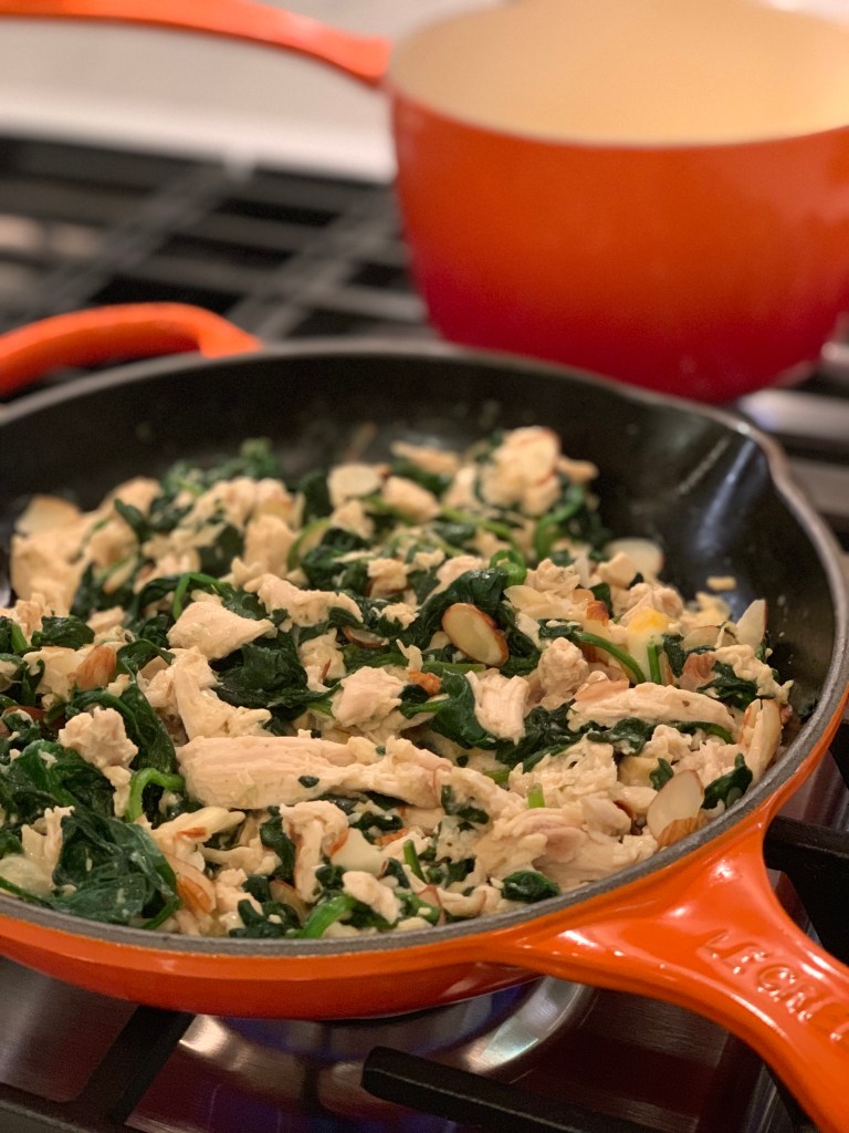 In a large skillet pan, drizzle olive oil over medium-low heat. Add the shredded chicken, dijon mustard, chicken broth, white wine, muenster and parmesan cheese. Mix well and allow the liquid to reduce. Next, add the spinach. While the spinach is wilting, add the seasoning and sliced almonds. Continue stirring over low heat.