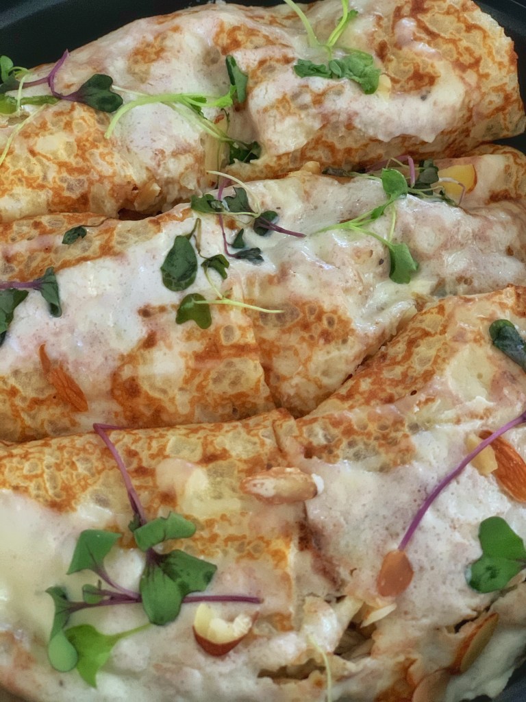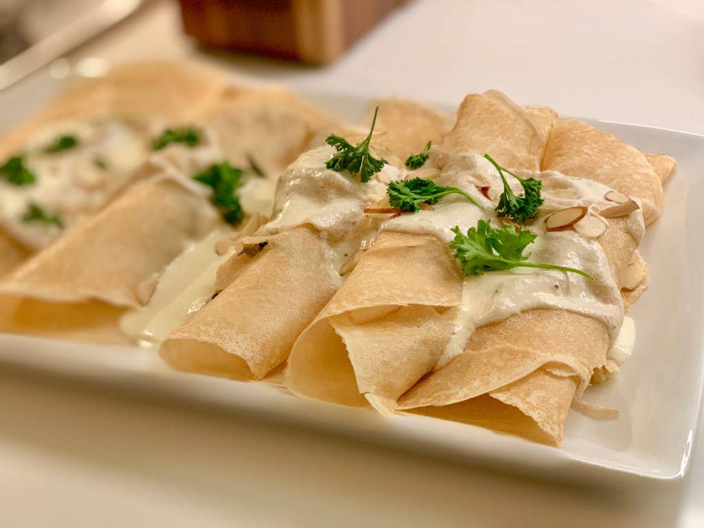 In a small saucepan, melt butter over medium heat – careful not to burn. Once the butter has melted, add in the white wine and cook for about half a minute. Next, add the cream, milk, lemon juice, seasoning and fresh thyme. While stirring frequently, allow the sauce to reduce by half – about five minutes. When the sauce has reduced, and the crepes have been stuffed and rolled, remove the sprig of thyme and pour the hot sauce over the rolled crepes. Sprinkle with additional almonds & lemon zest and serve hot.