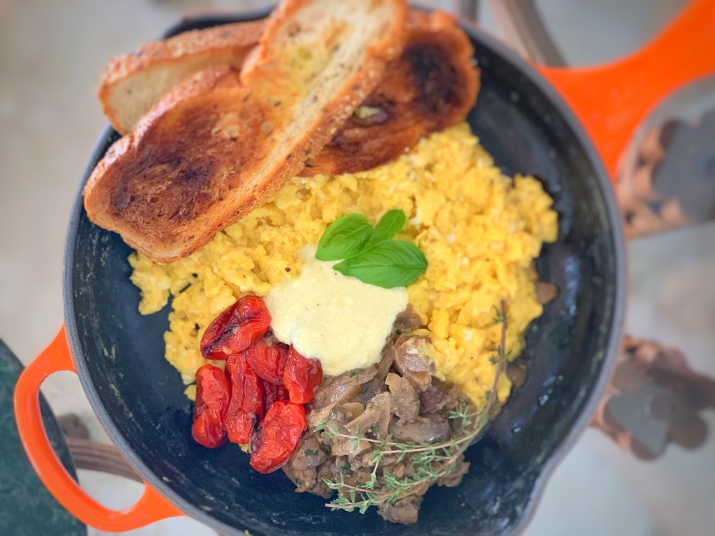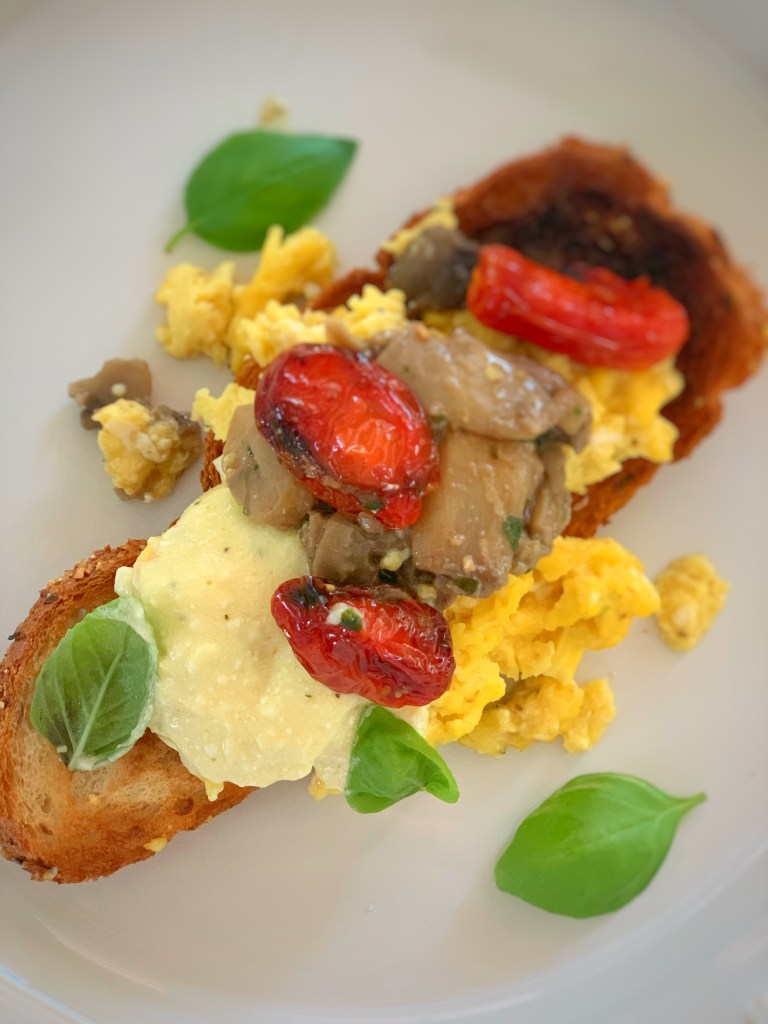 Serve the eggs hot with the tomatoes, mushrooms, and whipped feta. Garnish with the fresh basil.