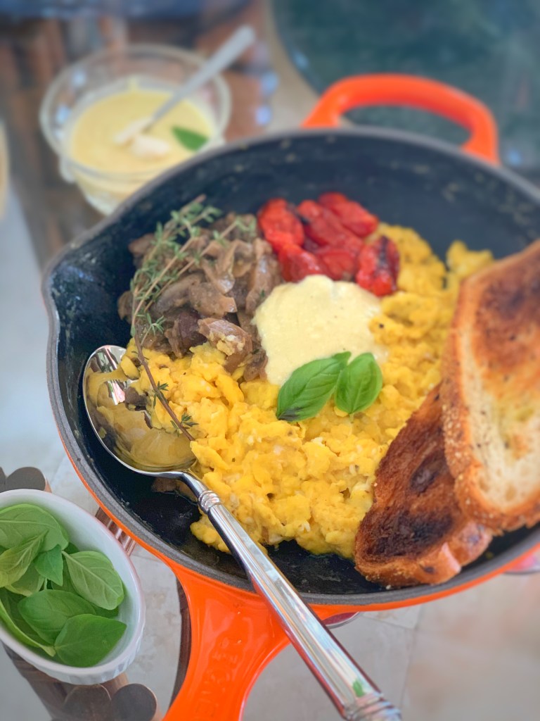 In the same non-stick skillet, heat a small amount of butter or olive oil over low heat. While the skillet is heating, crack the eggs in a a bowl and beat them just until the yolks and whites are combined. Add the milk and season with salt & pepper. Pour the eggs into the skillet. The key for silky, creamy eggs to cook them low and slow, stirring frequently and breaking up the curds as they form. It will take time, but it will be worth it. Season to your liking as they’re almost done cooking.