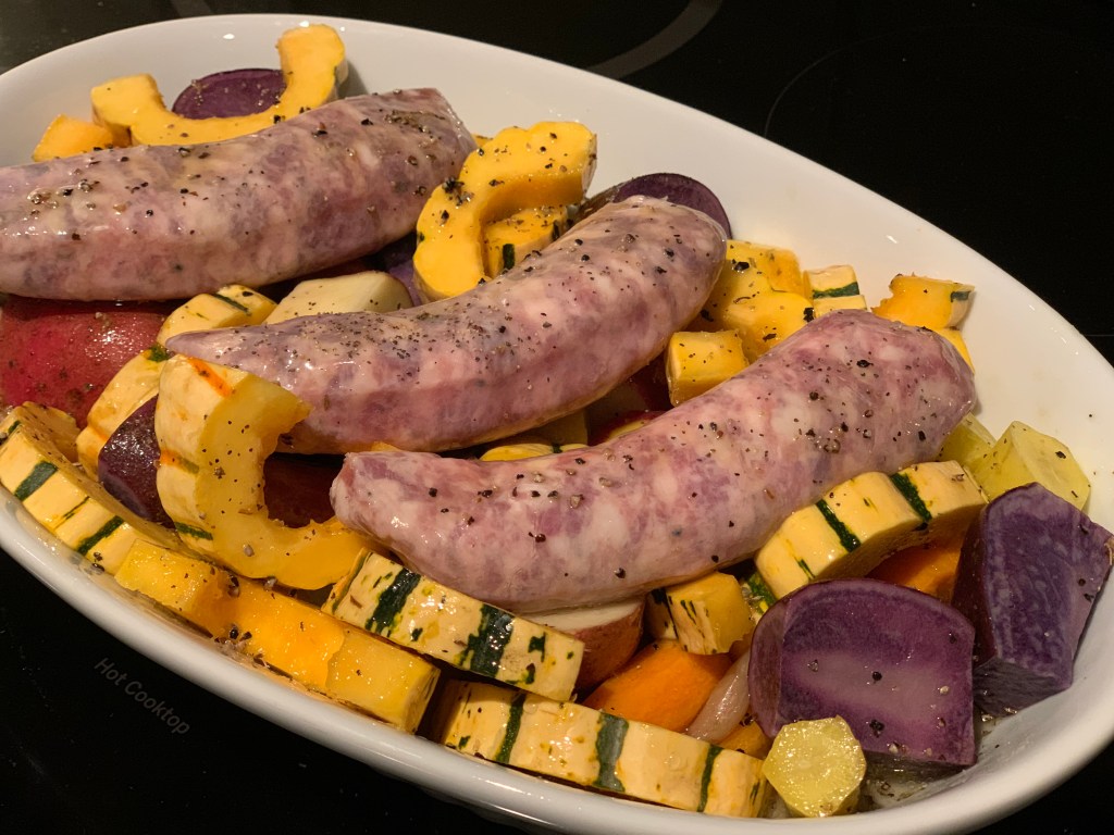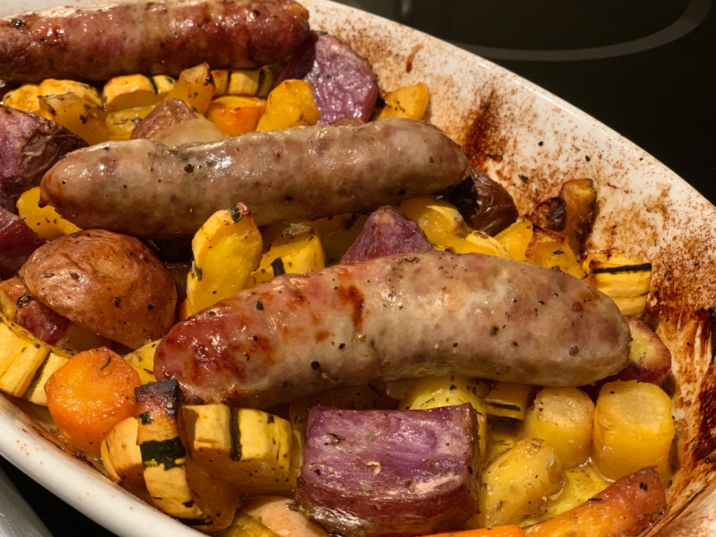 Place the sausages on top of the vegetables and drizzle with a little olive oil. Bake for 20 minutes uncovered. Turn over the sausages, cover with a lid or tinfoil, and continue to bake for another 10 minutes or until vegetables are soft and the sausage is cooked through. Serve hot.