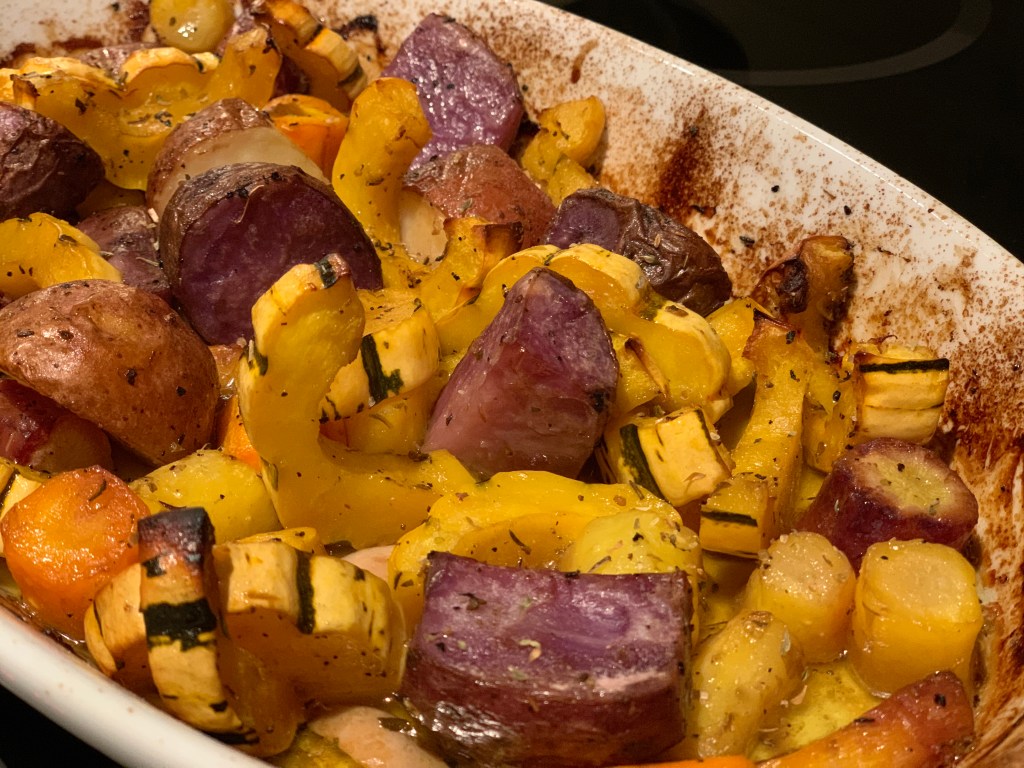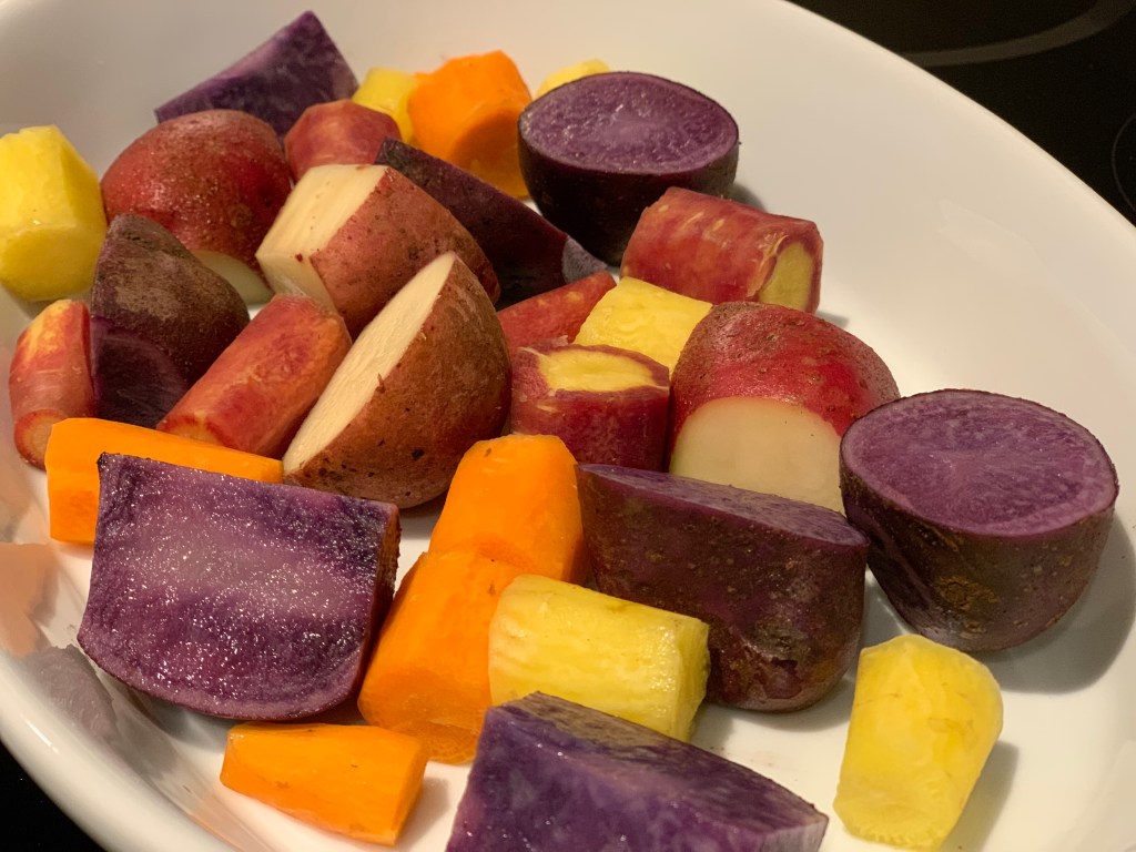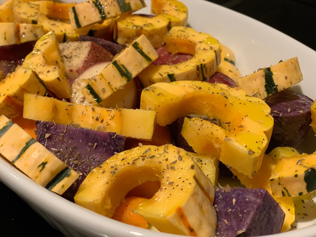 Peel the carrots and then wash all the vegetables, especially since you’ll be eating the skin of the squash and potatoes. Cut the ends off of the squash, slice the squash in half and then scoop out the seeds. Continue to cut squash into about 1-inch thick half moon shapes. Cut the carrots and potatoes into larger than bite-size cubes.