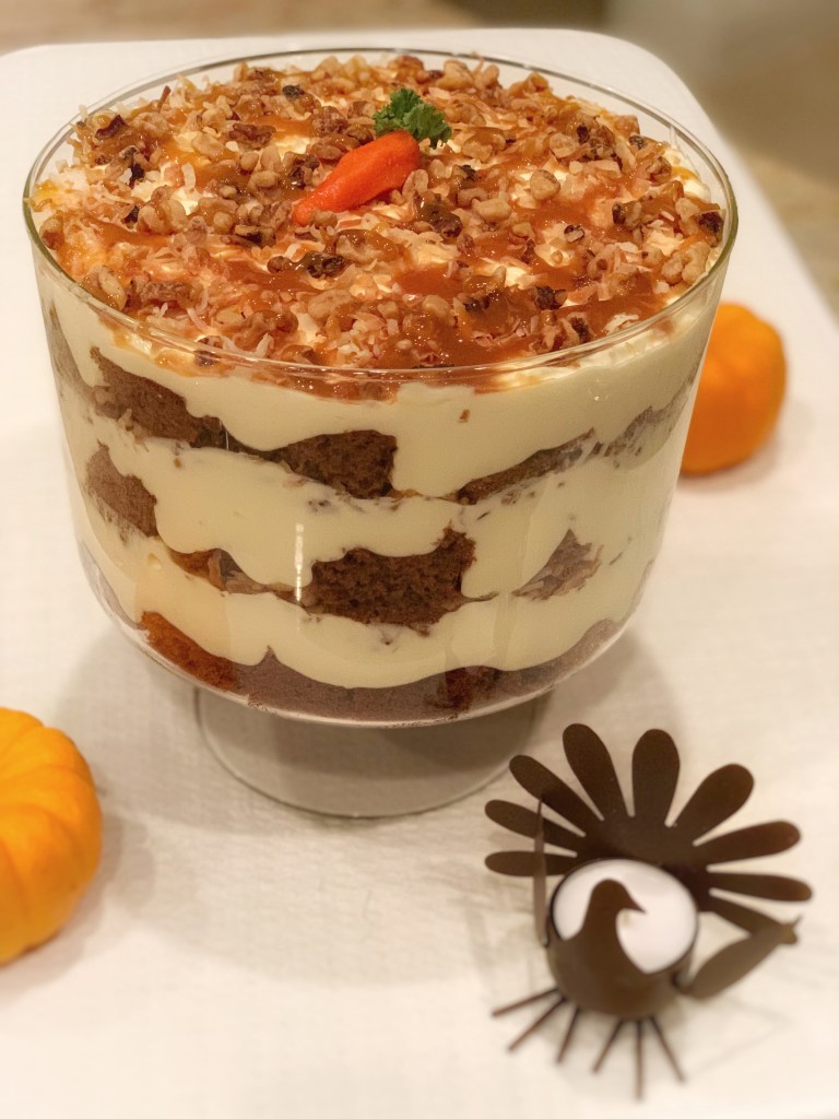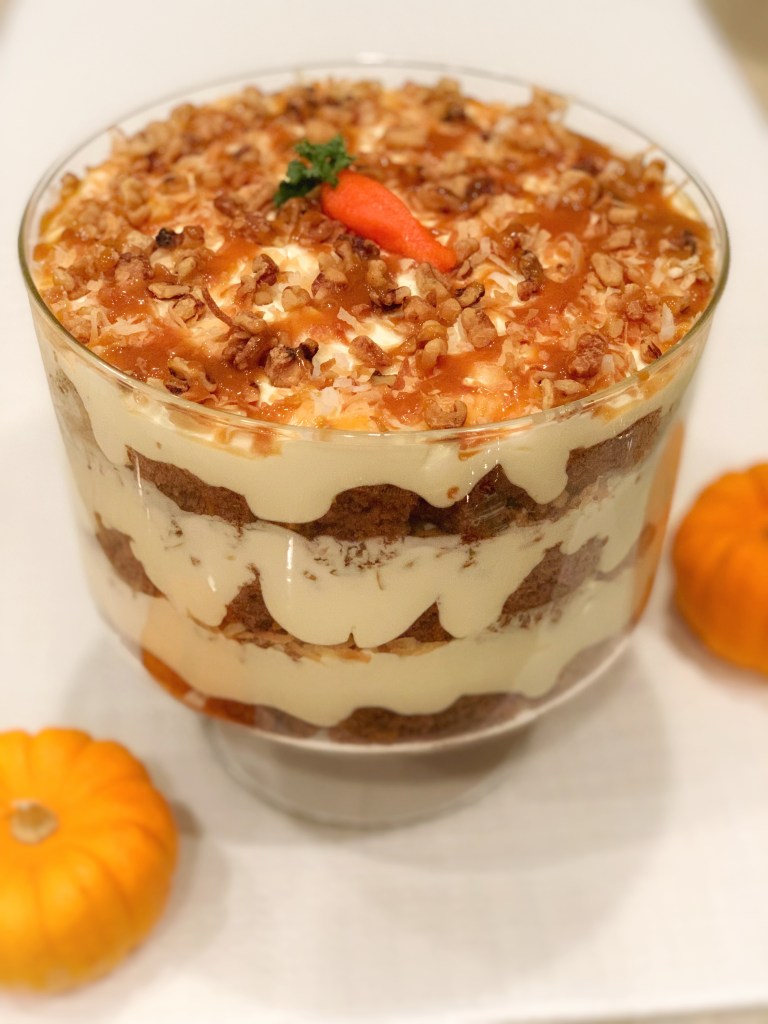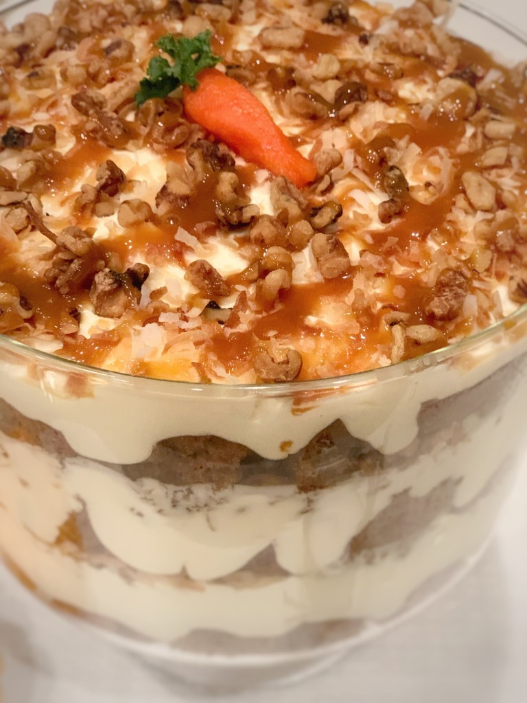 Keeping in the #TruHolidaySpirit with TruWhip, I whipped up an absolutely delicious carrot cake trifle. Inspired by an AllRecipes I came across, this recipe is a fun play on a traditional carrot cake. Instead of having to save the best bite with all the cream cheese frosting, every bite in this trifle has a creamy layer. In addition to being delicious and beautiful, it can also be made a day in advance. While I decided to use a box mix of carrot cake, you can of course make a homemade cake. Please share if you have a great homemade recipe!