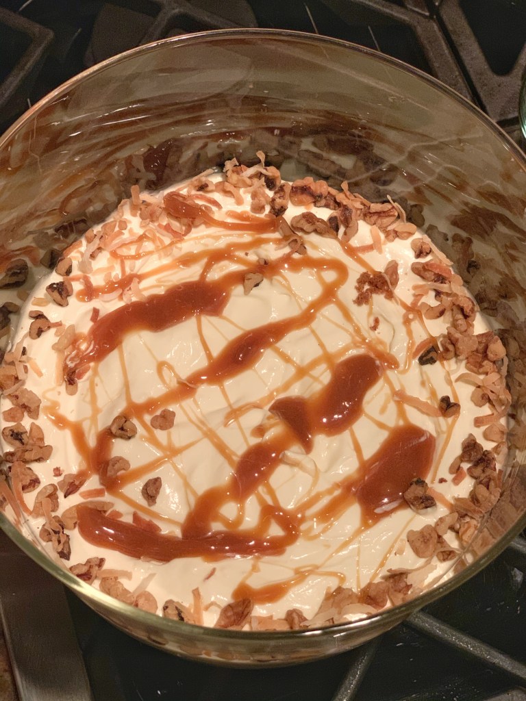 When the cake is cool, cut it into large bite-size pieces. In a trifle bowl, spread a layer of cake, and then spoon a layer of the filling on top, about the same depth as the cake layer. Sprinkle with walnuts, coconut and drizzle with the caramel sauce. Repeat the layering with remaining ingredients – you should end up with three layers of each. Decorate the top with the remaining coconut, walnuts and drizzles of the caramel. For directions to make marzipan carrots, follow these instructions.