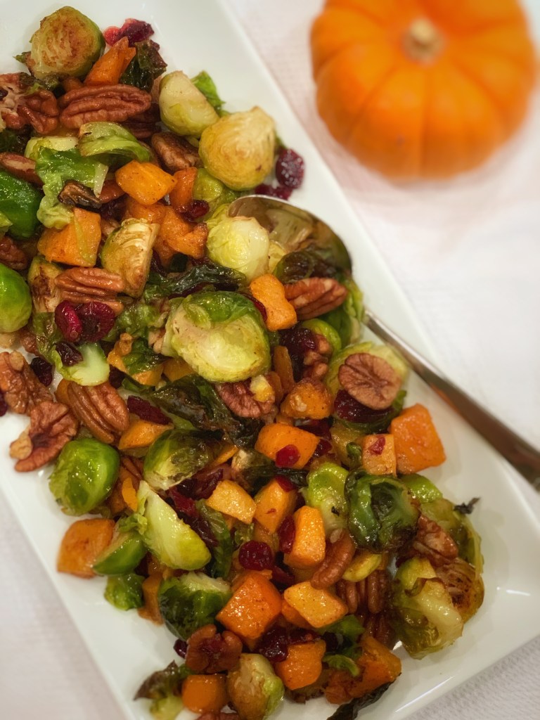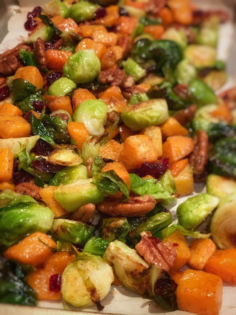 Once the vegetables are done cooking, add them into a large bowl and mix well with the toasted pecans and dried cranberries. Season with a little amount of salt, to taste. If you prefer to add more sweetness, drizzle a small amount of maple syrup and mix well. Serve warm.