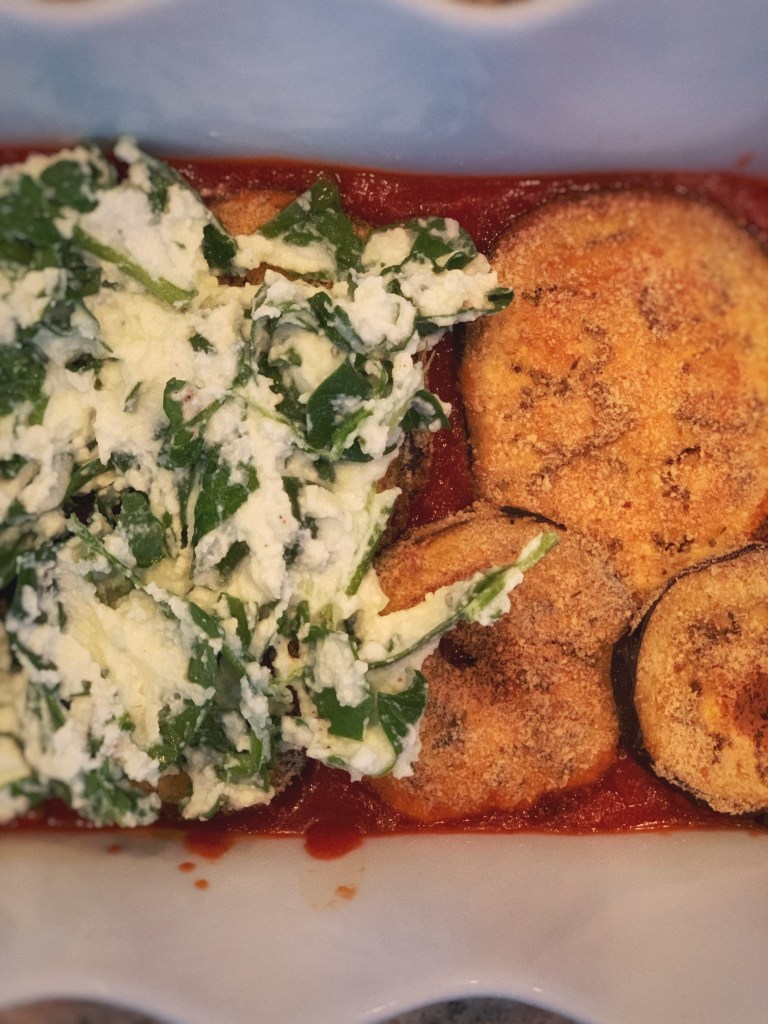 So you might laugh at me, but even Florida has chilly evenings and requires some warm, comfort food. While there has been by no means snow this winter, we have dipped into the 40’s – cold, right?! As such, I’ve been on the mission to create some heartier dinners. One can only eat so many meat dishes though, and so I turned to one of my favorites for inspiration – eggplant. There is so much flavor & texture in eggplant. This combination of roasted eggplant with tangy tomato sauce and creamy cheeses is so good, you won’t even realize there is no meat or pasta in this lasagna. Seriously, you will not miss them. Don’t skip the nutmeg, balsamic vinegar and fresh basil… they add another layer of flavor that really compliment the main ingredients.