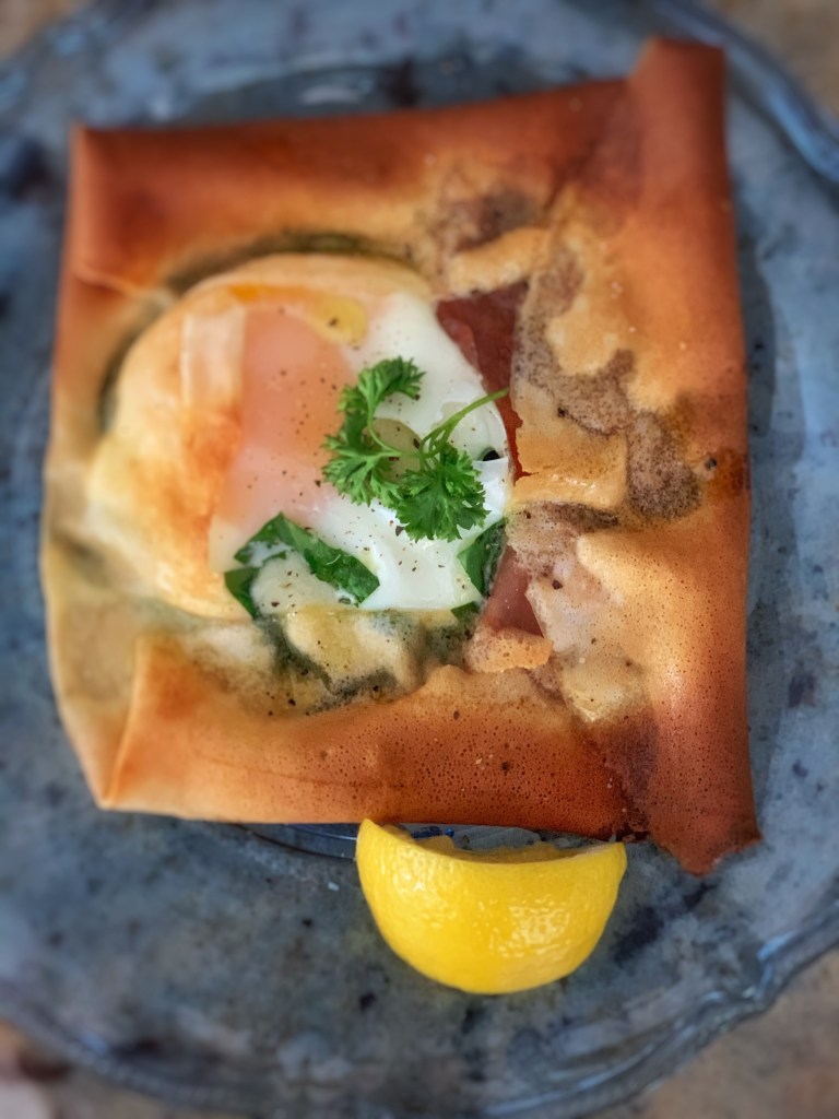 Place the crêpes on the baking sheet. Spread a thin layer of Dijon Mustard in the majority of the center of the crepes. Next, top each with spinach, cheese, basil, salt & pepper. Drizzle just a little bit of olive oil over the greens. Add the prosciutto and then crack an egg into the center of each crepe. Fold the edges of the crepe up towards the center, enclosing the fillings. Sprinkle with a dash of dried oregano, salt & pepper.